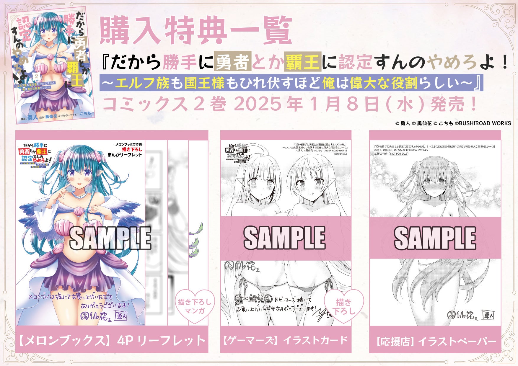株式会社ブシロード(本社:東京都中野区、代表取締役社⻑:木谷高明)のグループ会社にあたる株式会社ブシロードワークス(本社:東京都中野区、代表取締役社長:新福恭平)は、「コミックグロウル」にて好評連載中の『だから勝手に勇者とか覇王に認定すんのやめろよ!~エルフ族も国王様もひれ伏すほど俺は偉大な役割らしい~』第2巻が本日1月8日(水)に発売することをご案内致します。また、発売を記念した「異世界コミック」電子書籍フェアも実施中です。