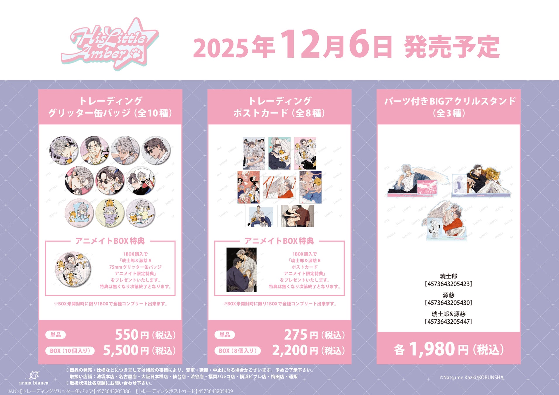 2025年12月6日(土)~2025年12月21日(日)のイベント開催期間中、アニメイト対象店舗にて『ヒズ・リトル・アンバー』(ナツメカズキ/光文社刊)関連のキャラクターグッズをご購入1,100円(税込)毎に、フェア購入特典「ブロマイド(全7種)」を1枚プレゼント!