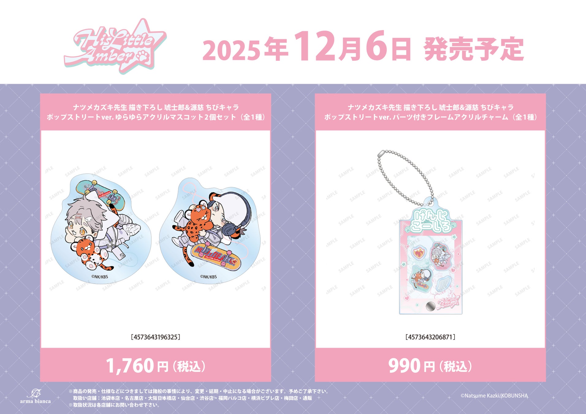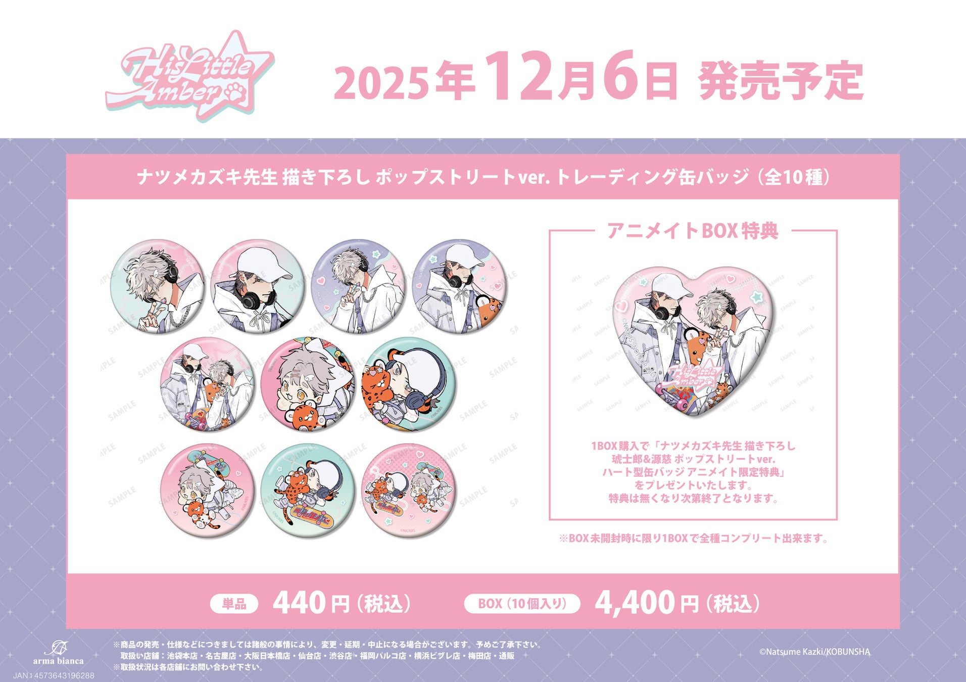 ※12月6日(土)より予約開始予定のECサイト「AMNIBUS」では、BOX購入特典として「ナツメカズキ先生 描き下ろし 琥士郎&源慈 ちびキャラ ポップストリートver. 75mm缶バッジ AMNIBUS限定特典」を予定しております。
