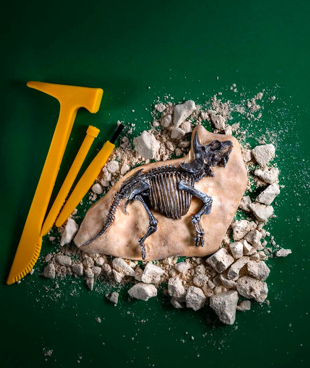 国立科学博物館に展示されているトリケラトプスの化石「レイモンド」の発掘体験ができるキット。アンモナイトの本物化石つき。