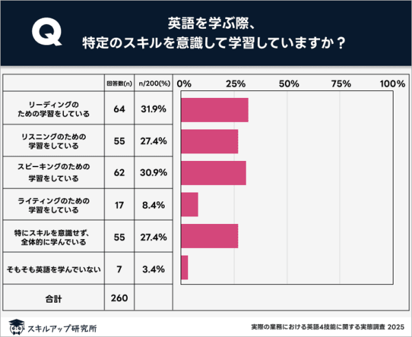 業務で英語を使用している社会人200人に「英語を学ぶ際、特定のスキルを意識して学習していますか」と質問したところ、「リーディングのための学習をしている」が31.9%と最も多く、次いで「スピーキングのための学習をしている」が30.9%という結果となった。