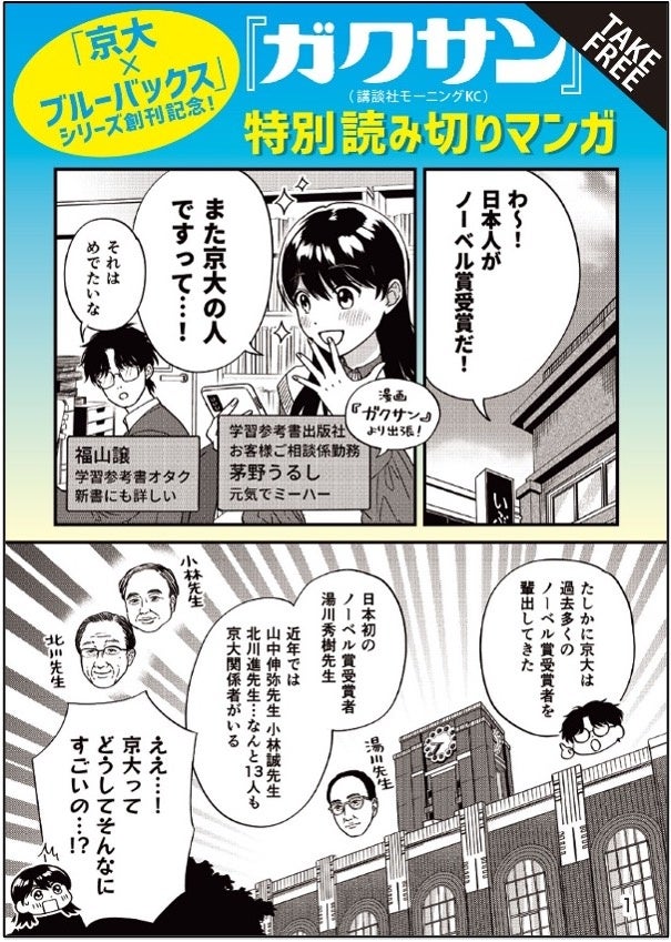 「京大理系」の世界を、楽しく、わかりやすく――。ブルーバックス編集部ではシリーズ刊行を記念して、特製のリーフレットを作成。コミック誌「モーニング」の連載で人気を博した『ガクサン』の作者・佐原実波さんに、読み切りマンガを描き下ろしていただきました。こちらは全国の書店に無料配布いたします。