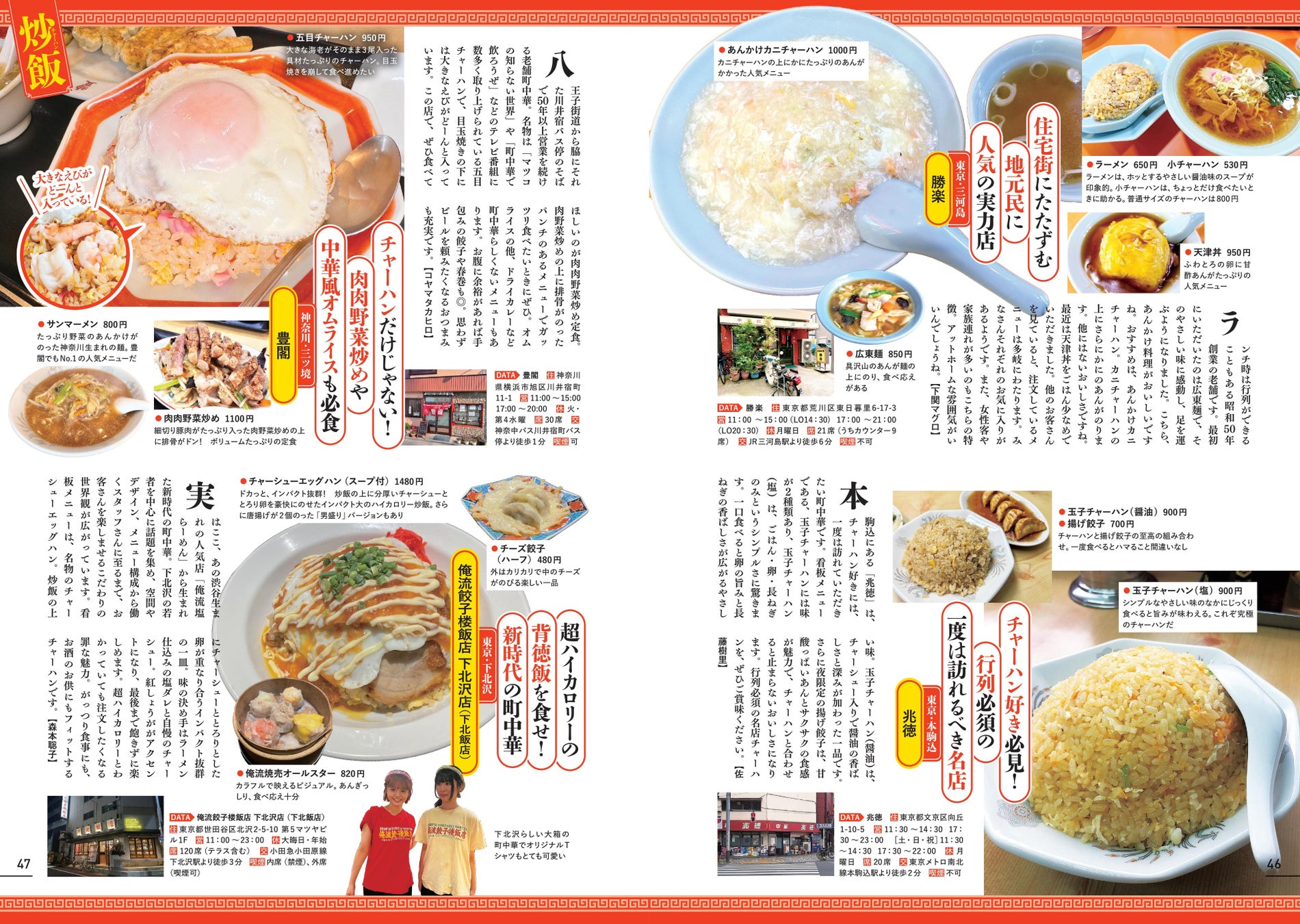 【麺】【餃子】【炒飯】【丼もの&皿めし】【定食・その他】にわけて、町中華探検隊がおすすめするメニューと店舗を紹介しています。彼らならではの関係値によって、これまでメディア掲載NGだった隠れた名店も掲載しています。