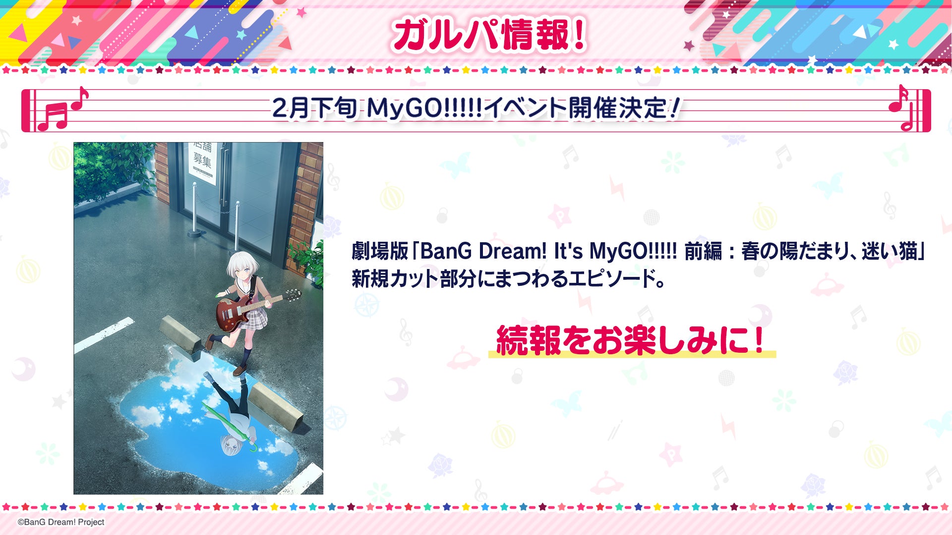 2月下旬にスマートフォン向けゲーム「バンドリ! ガールズバンドパーティ!」にて劇場版「BanG Dream! It’s MyGO!!!!! 前編 : 春の陽だまり、迷い猫」新規カット部分にまつわるエピソードが見られるゲーム内イベントの開催を発表いたしました。
