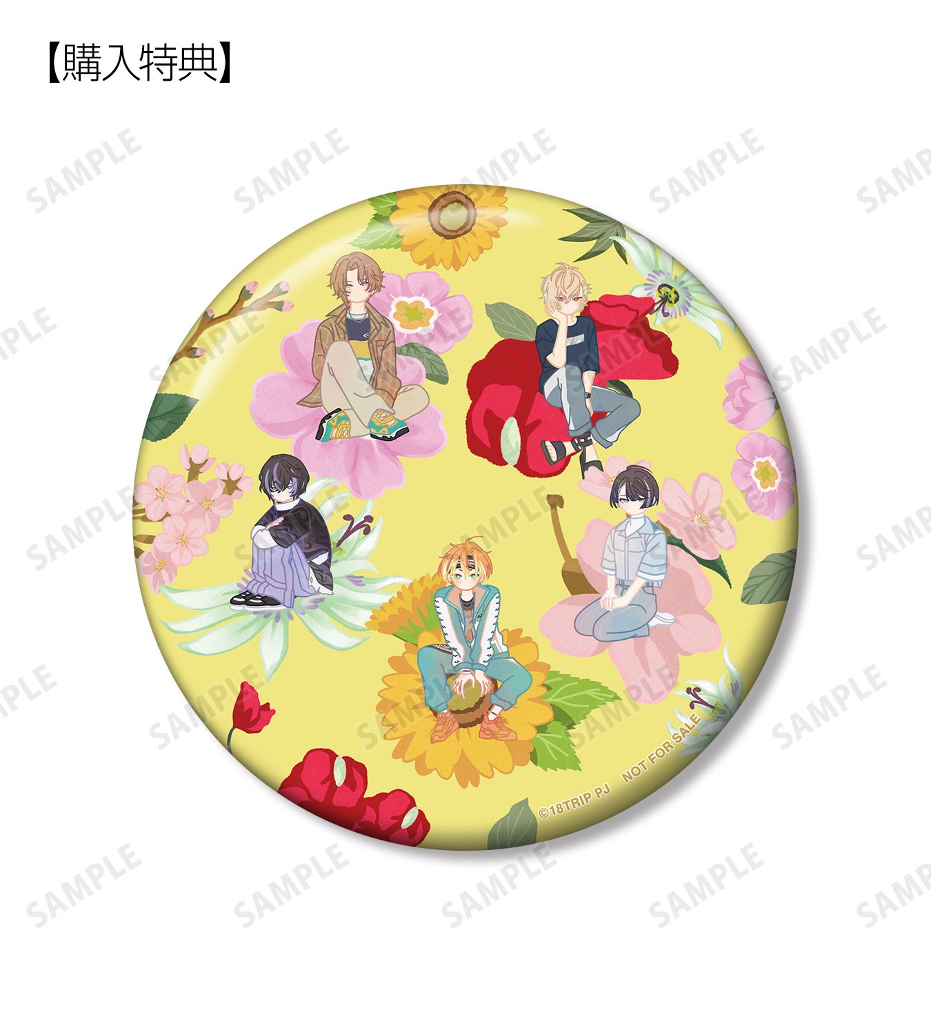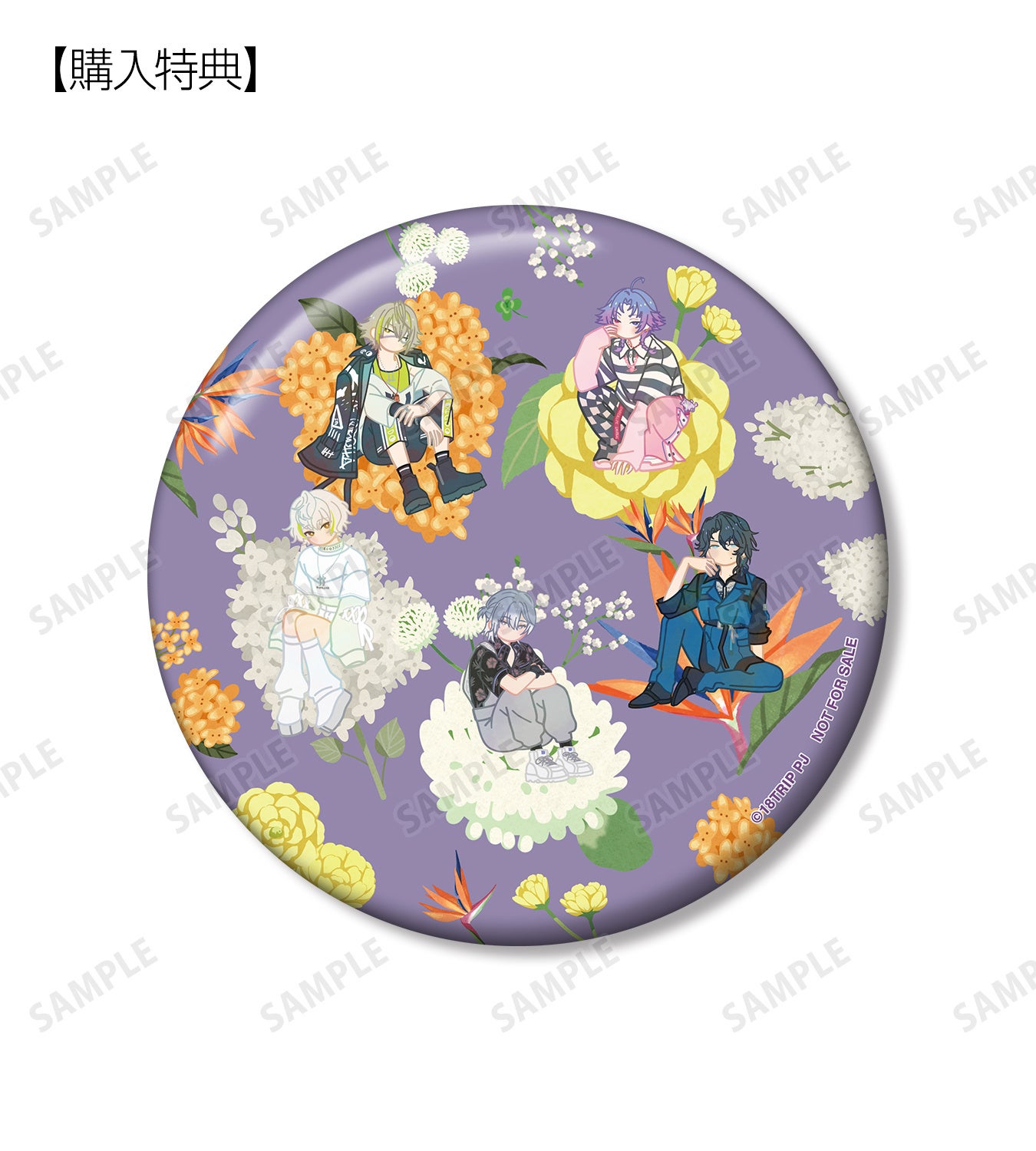 北片 來人、畔川 幾成、夏焼 千弥、木ノ内 太緒、百目鬼 潜、蜂乃屋 凪、白光 糖衣、白光 琉衣、棗 夜鷹、夜半 子タろのイラストをボタニカルデザインに落とし込んで繊細なタッチで新たに描き起こし、缶バッジに仕上げました。