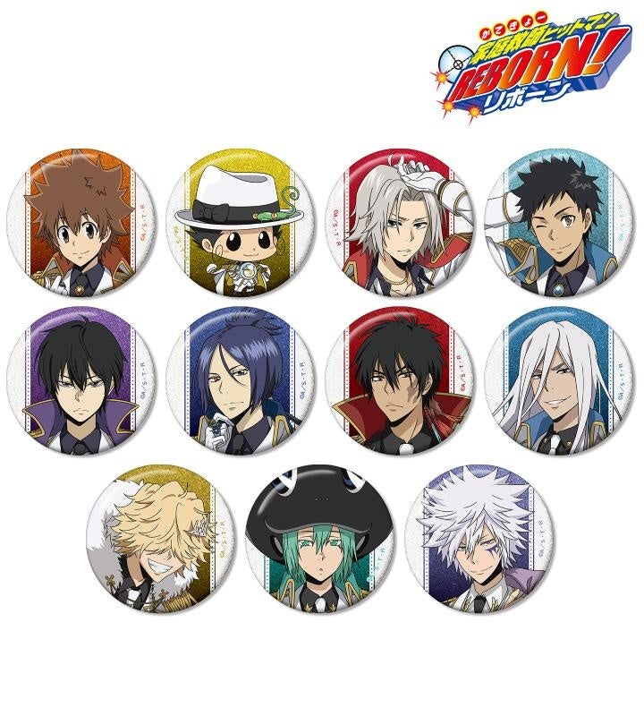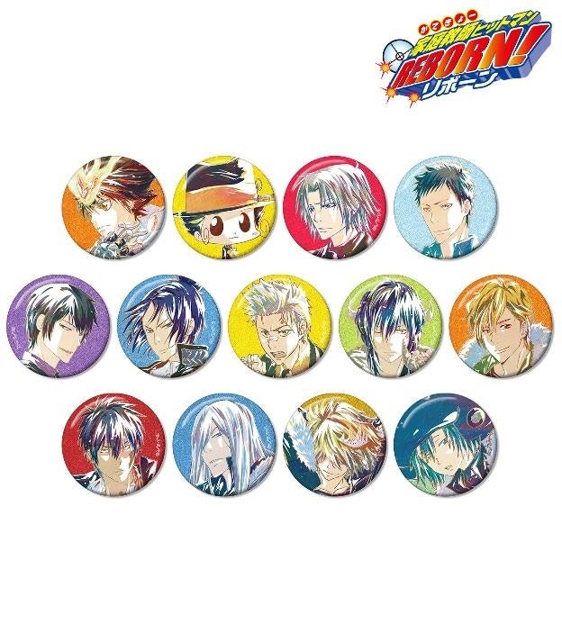 沢田 綱吉 、リボーン、獄寺 隼人(10年後)、山本 武(10年後)、雲雀 恭弥(10年後)、六道 骸(10年後)、笹川 了平(10年後)、大人ランボ、ディーノ(10年後)、XANXUS (10年後)、スペルビ・スクアーロ(10年後)、ベルフェゴール(10年後)、フランのイラストを新たなタッチで魅力的に表現し、グリッター加工を施した缶バッジに仕上げました。