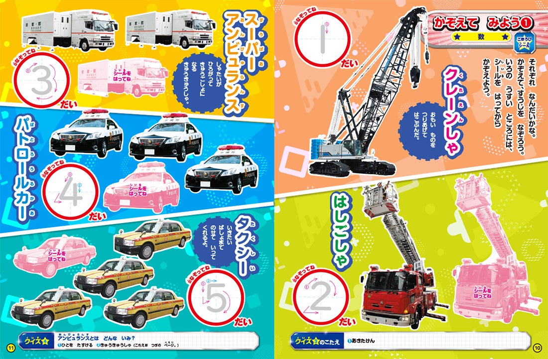 本誌の「おけいこページ」では、ひらがなや数、英語、時計などを、たくさんののりものといっしょに勉強できます。ページの下には、のりものクイズも掲載しており、学びを深めながら楽しく取り組むことができます。