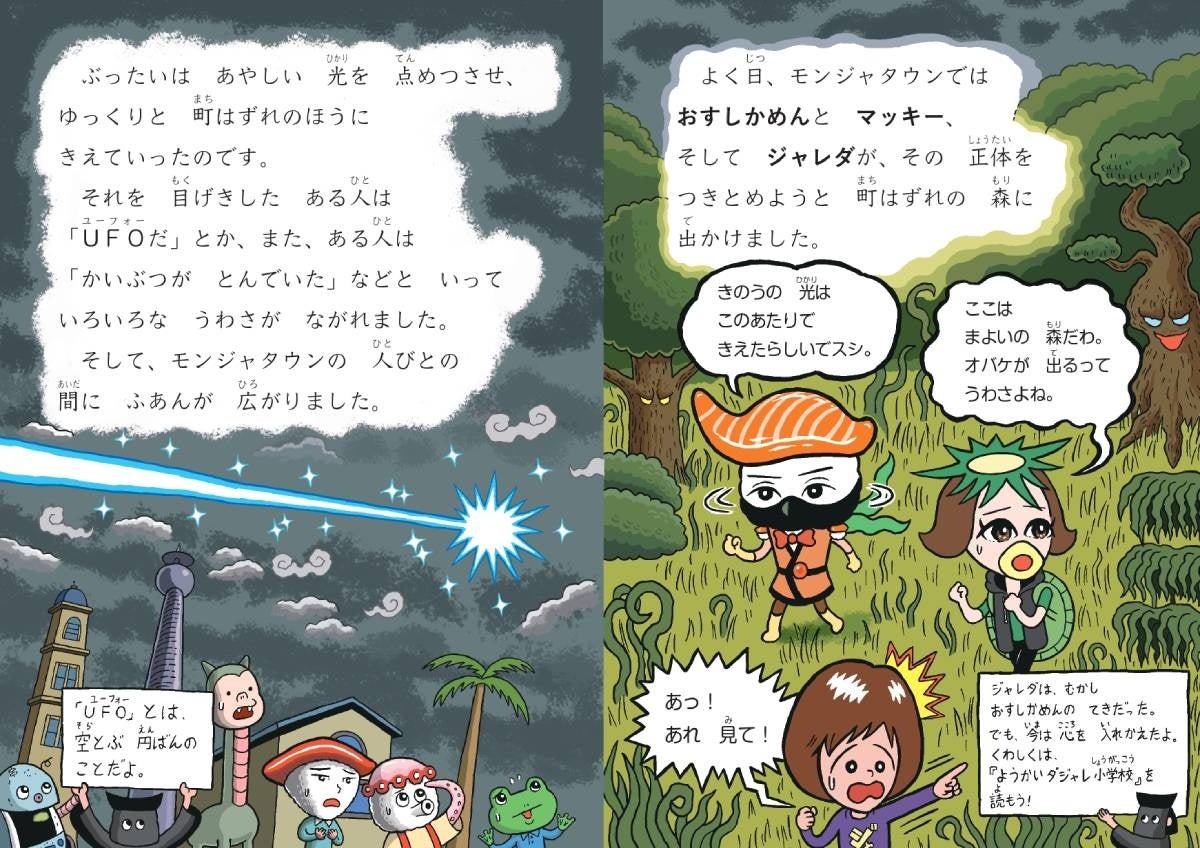 今回、正義のヒーロー・おすしかめんの前に、謎のUFOに乗ってやってきた「うちゅうニンジャ」が登場。ラーメンや冷蔵庫がモチーフの個性的なうちゅうニンジャたちに、おすしかめんの仲間が立ち向かうも、まったく歯が立たず、さあ大変! おすしかめんは、持ち前の技や知恵を使って、このピンチをどう切りぬけるのか!?「うちゅうニンジャへん」の最初のお話になりますので、これまでのお話を読んでいなくても楽しめます。