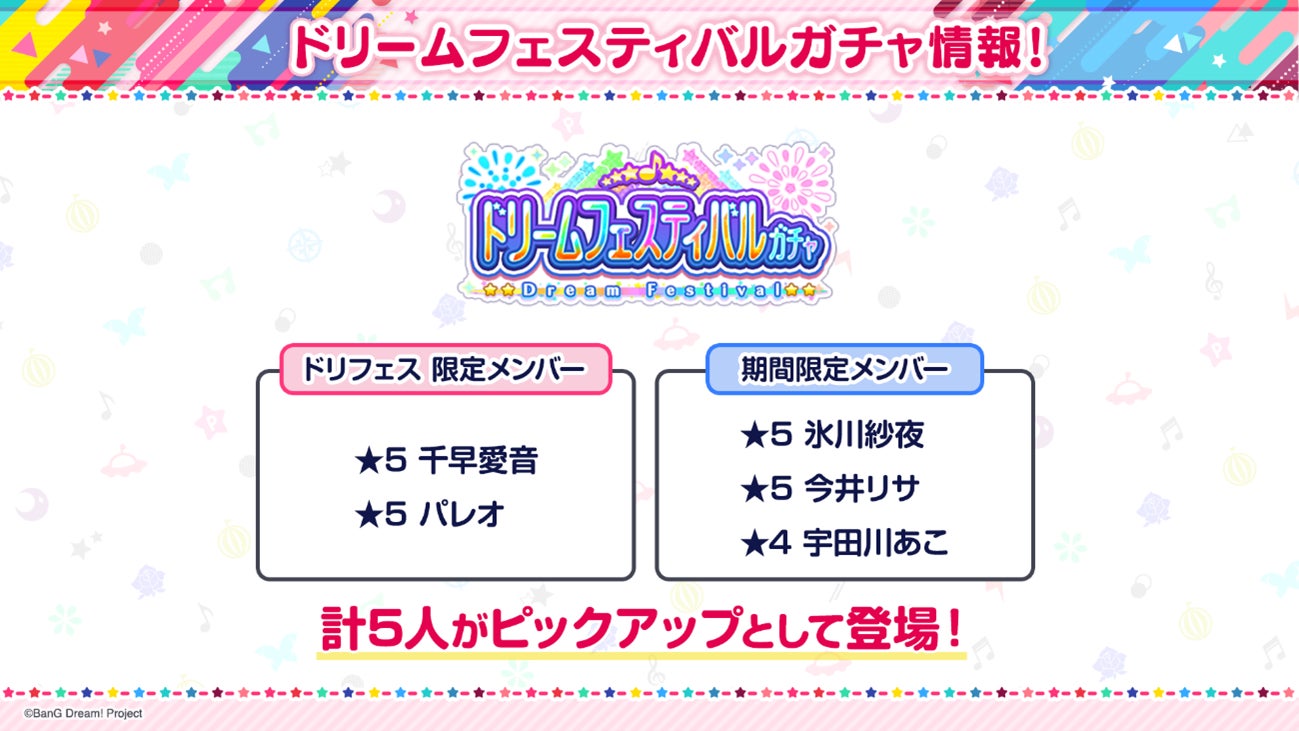 1月31日(金)15時より「ドリームフェスティバルガチャ」の開催が決定いたしました。今回のドリフェス限定メンバーとして★5千早愛音、★5パレオが登場いたします。