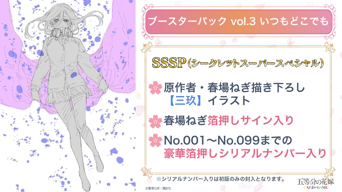 ※SSSP(シークレットスーパースペシャル)は、原作者・春場ねぎの描き下ろしイラスト&箔押しサインと、No.001~No.099までの豪華箔押しシリアルナンバーが入ったスペシャルなカードです