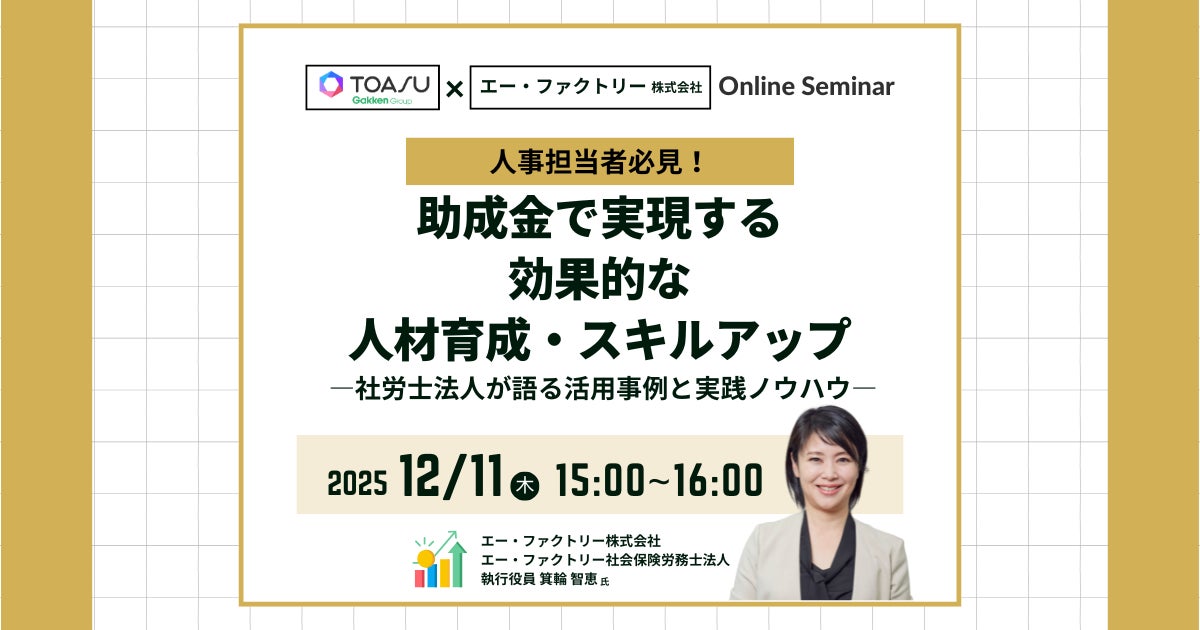 株式会社 学研ホールディングス(東京・品川/代表取締役社長:宮原博昭)のグループ会社、株式会社TOASU(東京・品川/代表取締役社長:宮田 晃)は、2025年12月11日(木)に無料のオンラインセミナー「人事担当者必見! 助成金で実現する効果的な人材育成・スキルアップ―社労士法人が語る活用事例と実践ノウハウ―」を開催いたします。