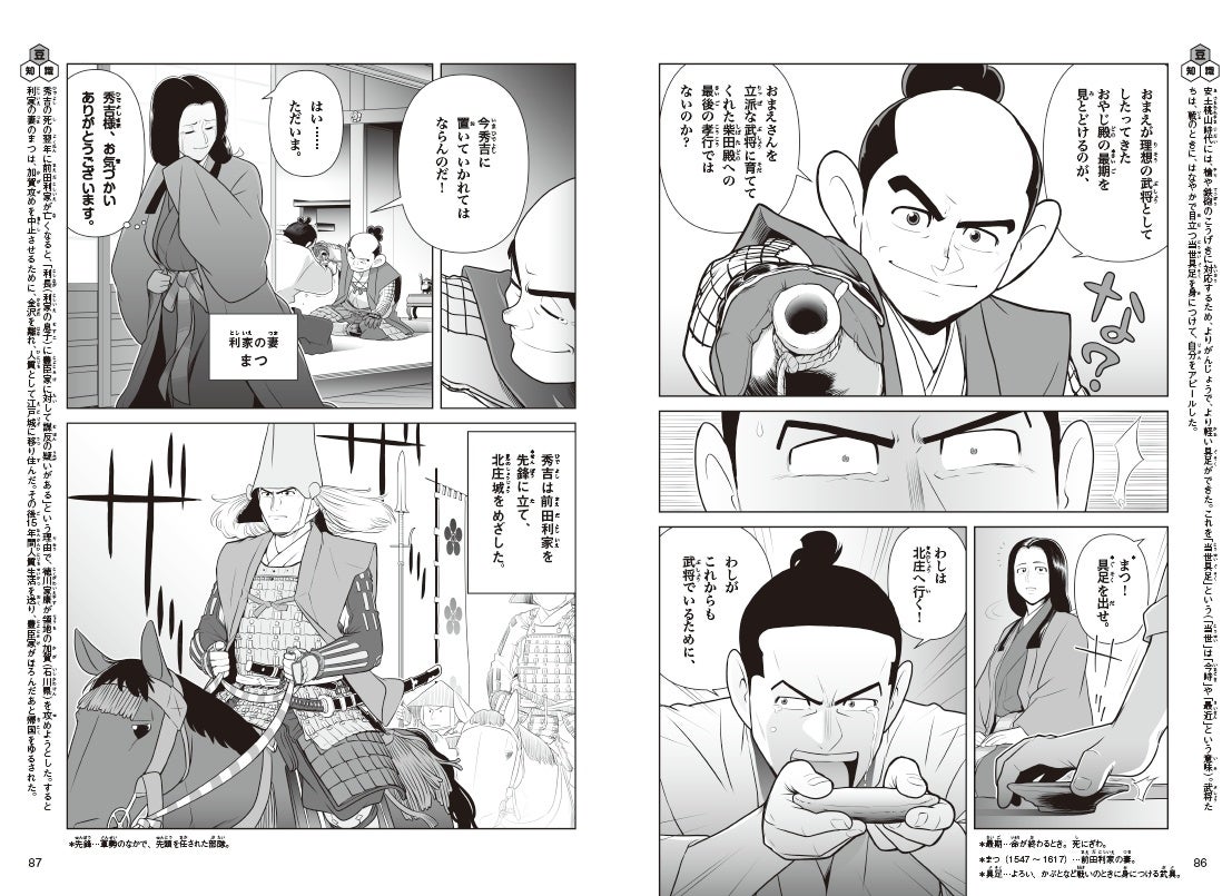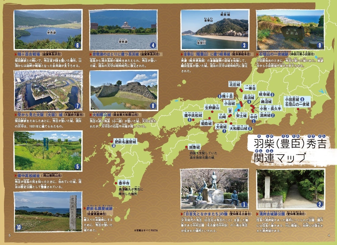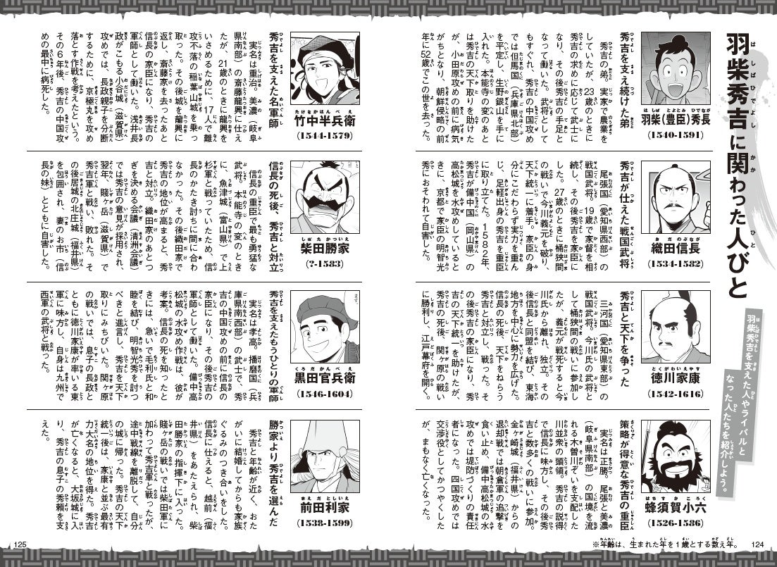 見返しページには地図や豊富な写真で構成された「羽柴(豊臣)秀吉関連マップ」を収録。巻末ページは秀吉・秀長の業績や、関連人物紹介、年表などもそろっているので、まんがの内容をより深く理解できると同時に、大河ドラマの予習にもぴったりです。