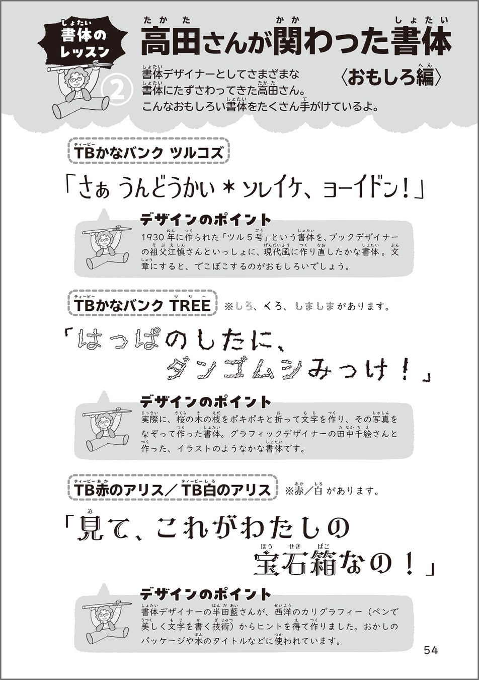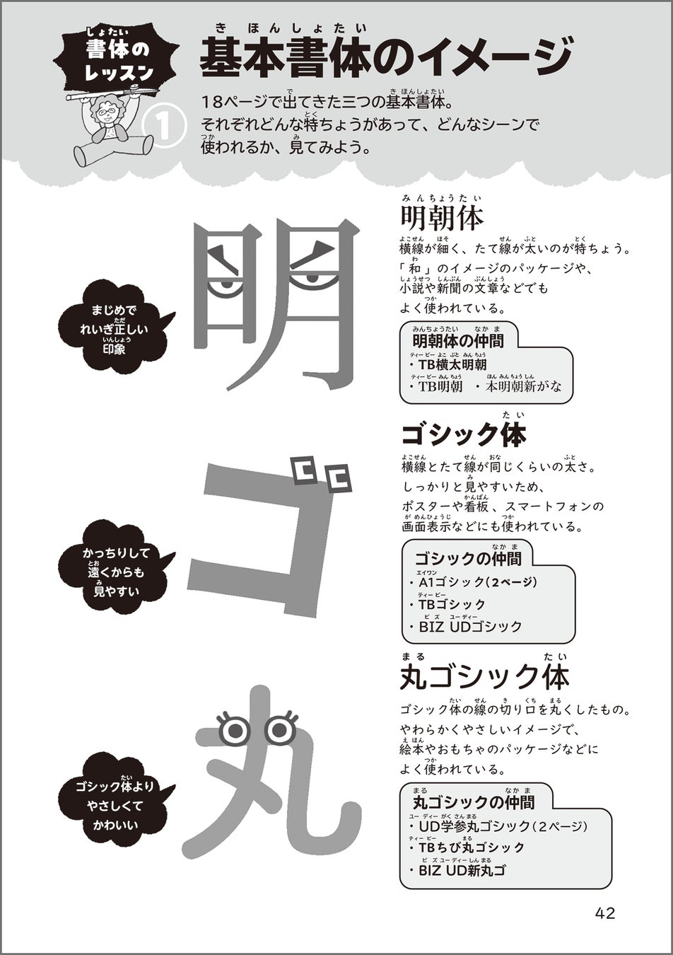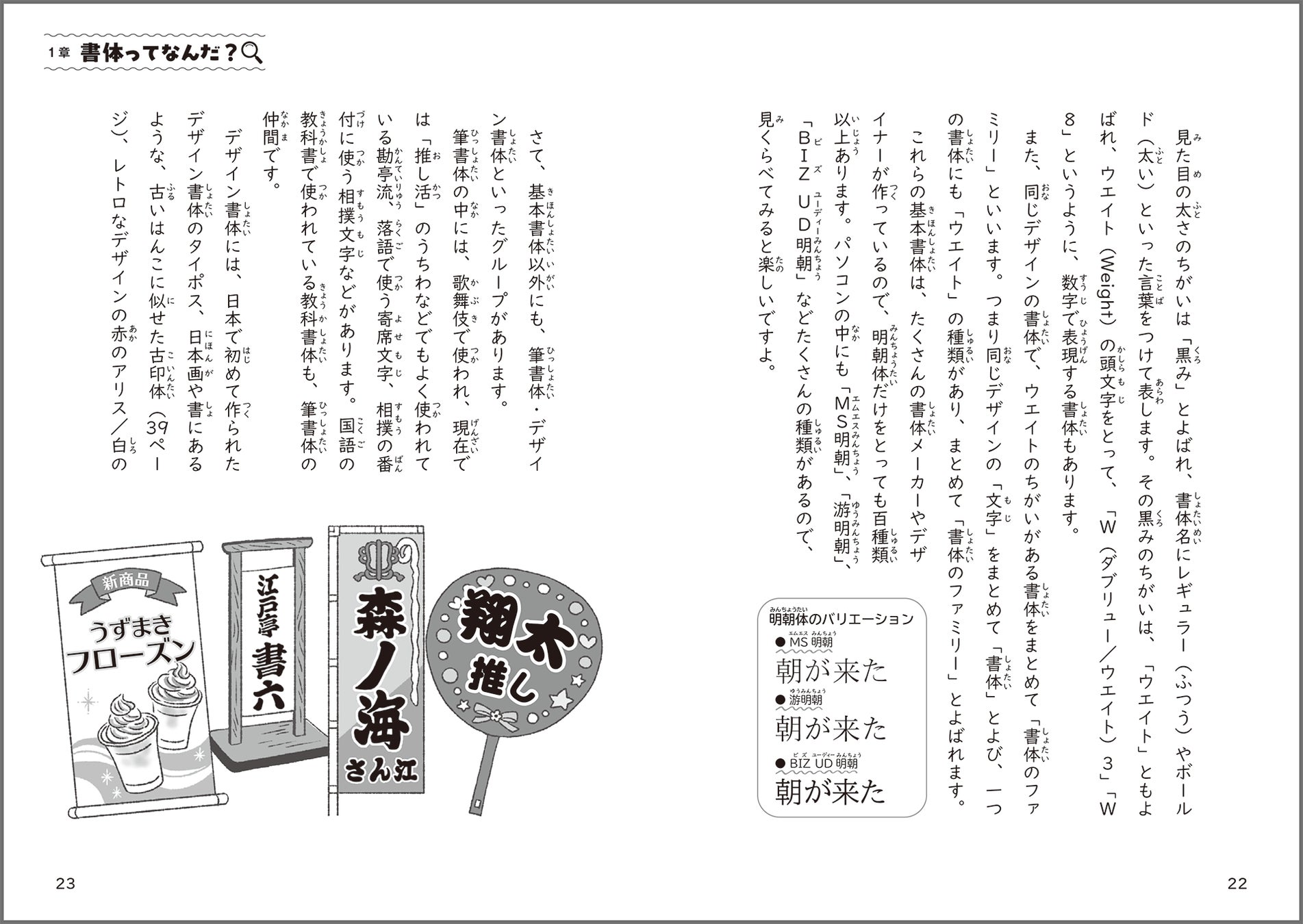 章と章の間には、三大書体(明朝体、ゴシック体、丸ゴシック体)をキャラクター化して紹介したり、高田さんが今まで手がけてきた書体を紹介したりするコラムも。書体の楽しさや奥深さを、ビジュアルとともに理解できます。