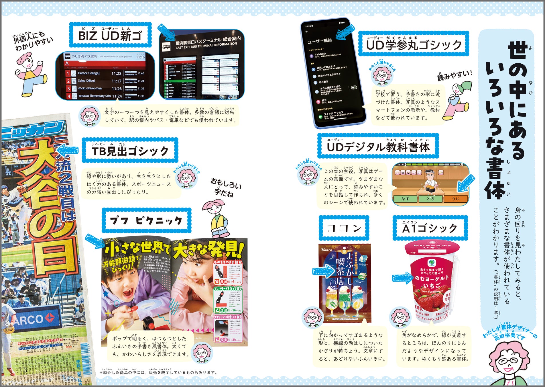 「書体ってなんだろう?」「世の中にはどんな書体があるのだろう?」と、まずは身の回りに目を向けたくなるカラーページからスタート。お子さまが自分ごととして、書体やユニバーサルデザインに向きあうきっかけにもなるはずです。