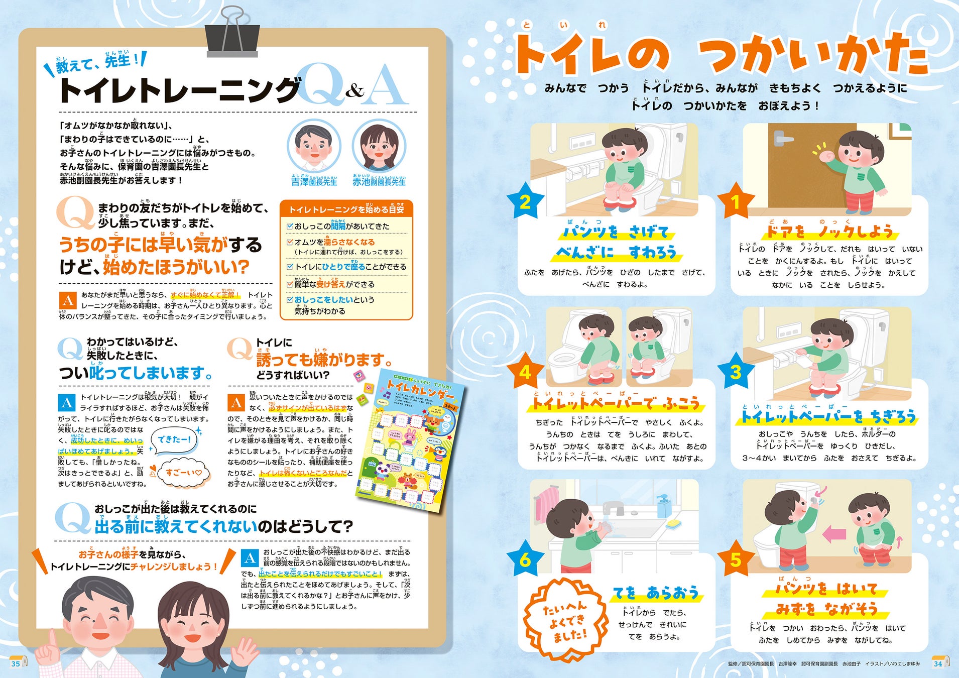遊びながらトイレに興味を持ってもらうことで、苦戦するトイレトレーニングもチャレンジしやすい! お気に入りのぬいぐるみやおもちゃをトイレに座らせてお世話していたら自然とトイレ習慣が身に着く一冊です。