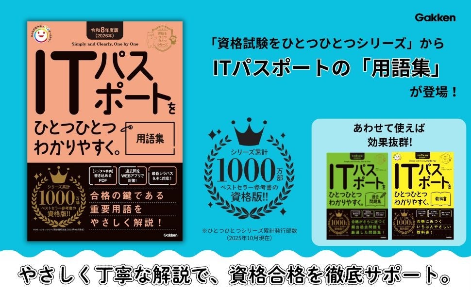 株式会社 学研ホールディングス(東京・品川/代表取締役社長:宮原博昭)のグループ会社、株式会社 Gakken(東京・品川/代表取締役社長:南條達也)は、2025年11月27日(木)に『令和8年度版(2026年) ITパスポートをひとつひとつわかりやすく。教科書』『同 過去問題集』『同 用語集』の3冊を発売いたしました。