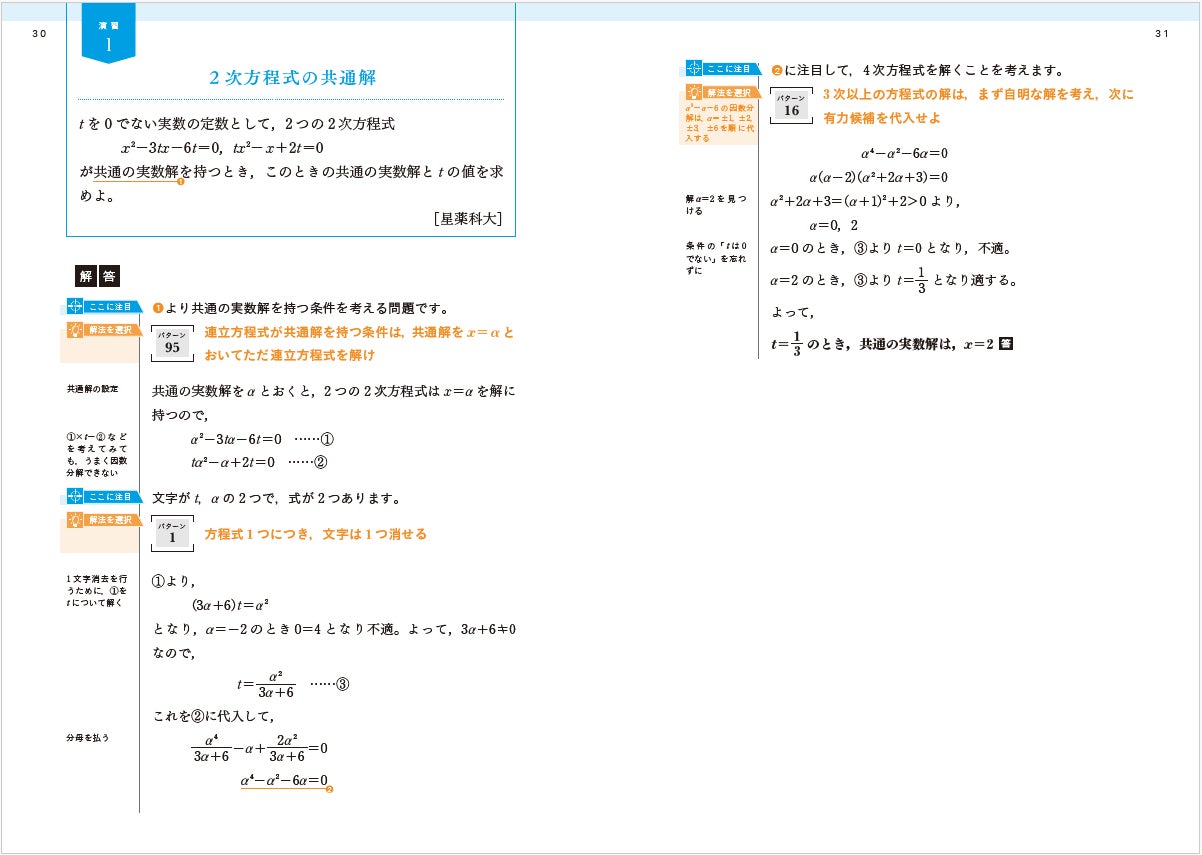 演習には、大学入試の標準レベルから応用レベルの問題が80題収録されています。わかりやすい解説はもちろんのこと、「問題文のこの部分を読みとれば、パターン○○を使って解けることがわかる」といった、河野氏の思考プロセスがていねいに言語化されており、数学の読解力やスムーズな解き方を身につけることができます。
