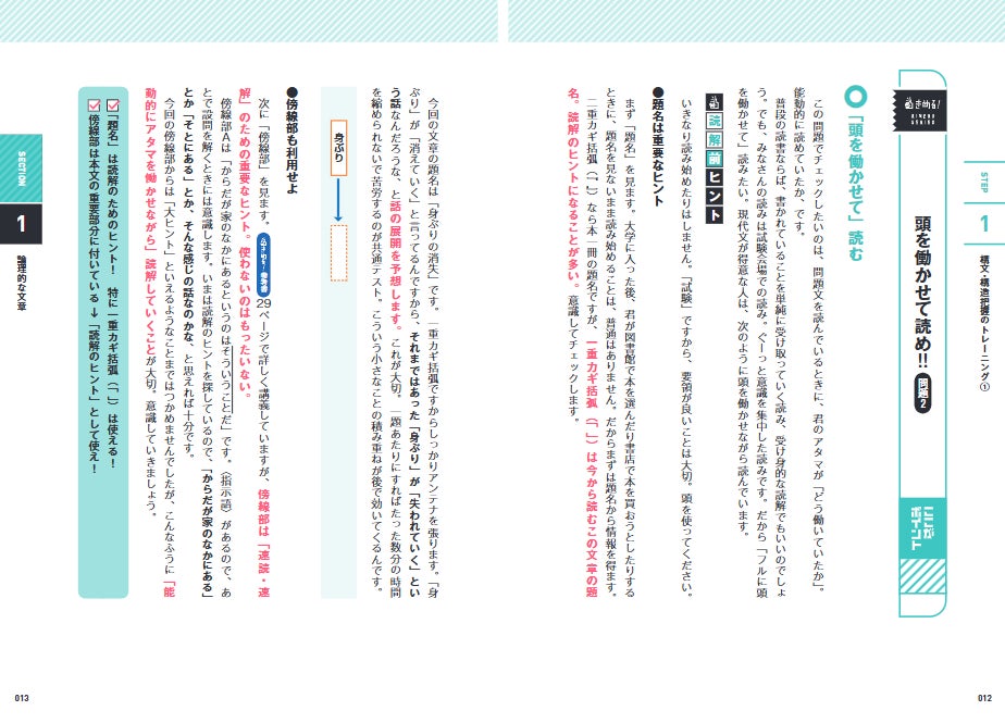 本書は、まずは、弱点をしっかりあぶり出すところからスタートし、効率よくトレーニングできる構成になっています。Section1「論理的な文章」と Section2「文学的な文章」の冒頭には、それぞれ読解力をチェックする問題を用意。最初に自分の弱点を把握することで、的確に学習を進められます。