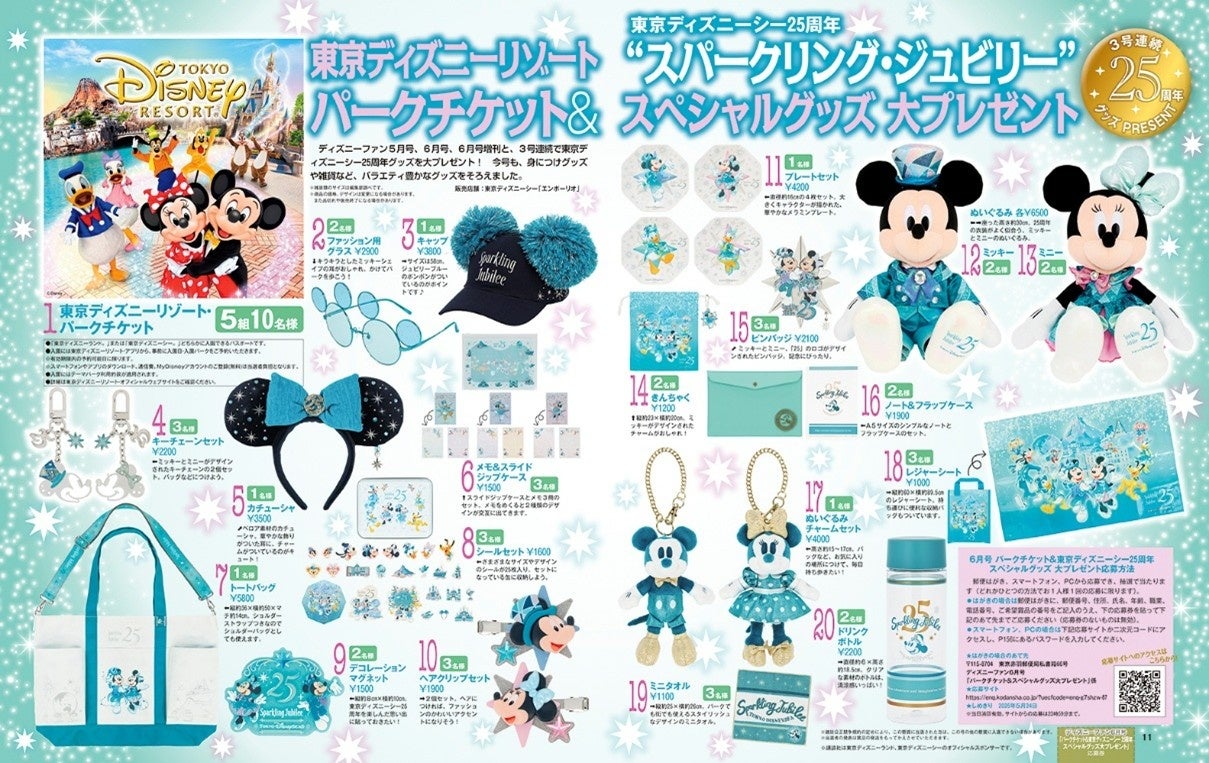 さらにスペシャルなプレゼント企画も。ディズニーファン5月号、6月号、そして6月号増刊の3号連続で、東京ディズニーリゾート®のパークチケットと「東京ディズニーシー25周年“スパークリング・ジュビリー”」のスペシャルグッズが抽選で当たるキャンペーンを実施中! このチャンスをお見逃しなく!