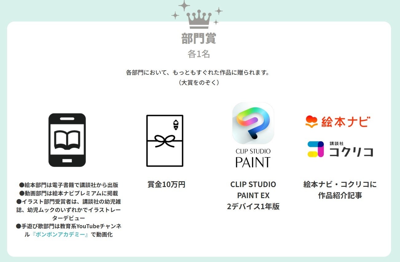 クリエイター支援として、応募者のうち希望者先着300名に作品制作用アプリとして「CLIP STUDIO PAINT」を提供。くわしくはこちら→https://www.ehonnavi.net/pb-innovation-award/