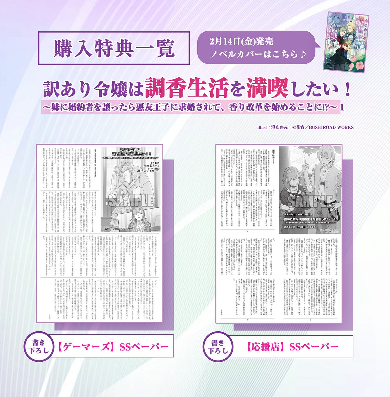 株式会社ブシロード(本社:東京都中野区、代表取締役社⻑:木谷高明)のグループ会社にあたる株式会社ブシロードワークス(本社:東京都中野区、代表取締役社長:新福恭平)は本日2月14日(金)に「ブシロードノベル」より『訳あり令嬢は調香生活を満喫したい!~妹に婚約者を譲ったら悪友王子に求婚されて、香り改革を始めることに!~』第1巻が発売することをご案内致します。また、発売を記念した電子書籍フェアも実施中です。