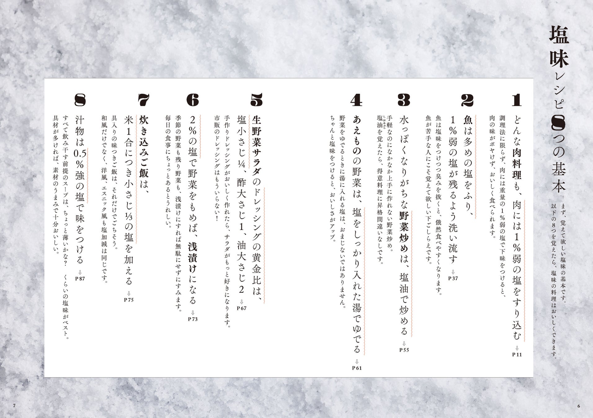 本書では、塩味レシピをおいしくする【8つの基本】に基づいて、主菜からスープまで、バリエーション豊かなレシピを掲載。食材、調理法別に塩の分量を決めているので、わかりやすさも抜群です。「塩味」レシピなら、限られたスペースを使わない調味料に占拠されることもなくなるので、キッチンもすっきりミニマルに! いいことたくさんの「塩味」レシピを、ぜひ本書でマスターしてください。