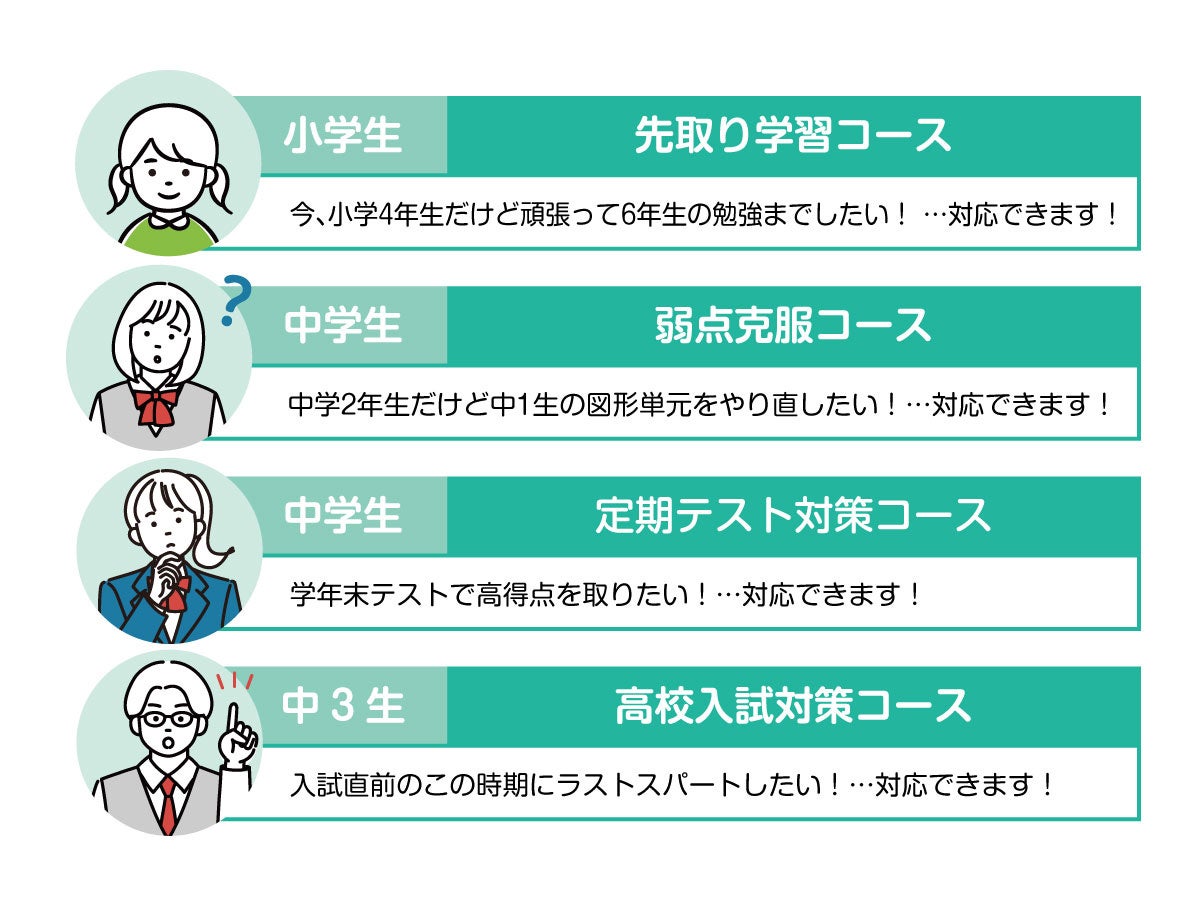 お子様の学校行事や部活、習いごとなどに合わせて日程を調整することが可能です。部活の大会で日程が合わない、クラブチームの活動が忙しくて普段通っている塾の講習会に参加できない、などの理由で、講習会期間にサインワンオンライン校を利用される方もいらっしゃいます。