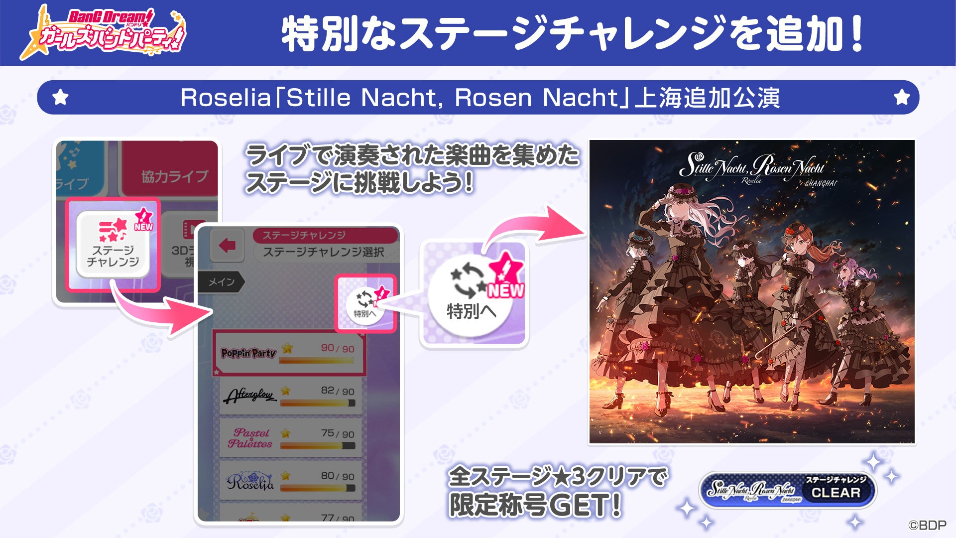 スマートフォン向けゲーム「バンドリ! ガールズバンドパーティ!」内、ステージチャレンジ「特別」に、本ライブで演奏された楽曲を集めたステージを追加しました。