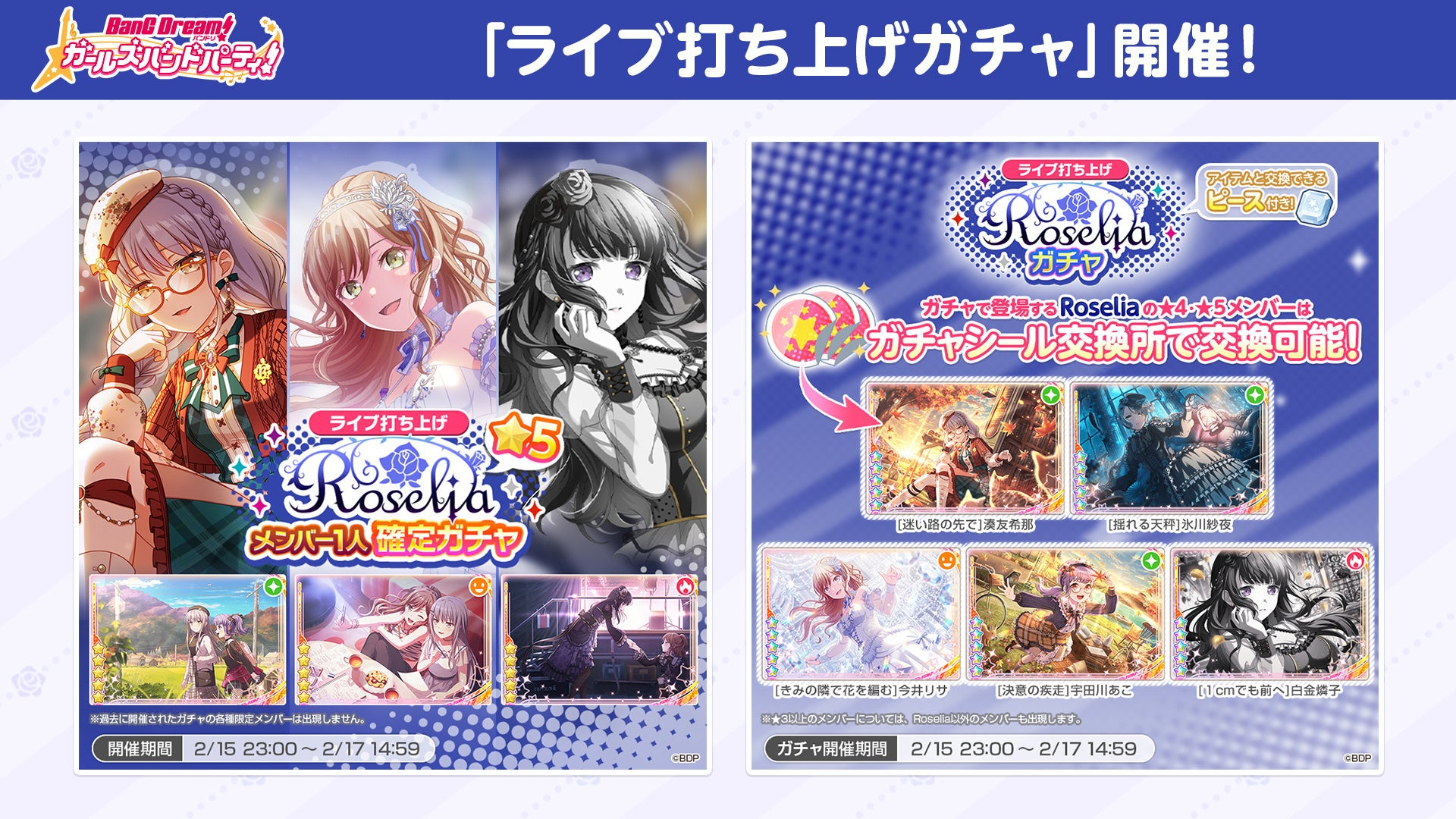 本ライブ開催を記念して、「ライブ打ち上げガチャ」が開催中です。Roseliaメンバーの出現率がアップするほか、様々なアイテムと交換できるピース付きとなります。