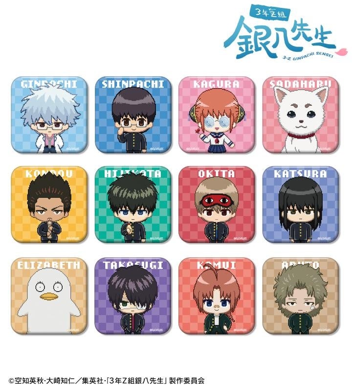 坂田銀八、志村新八、神楽、定春、近藤勲、土方十四郎、沖田総悟、桂小太郎、エリザベス、高杉晋助、神威、阿伏兎をドットイラストで魅力的に表現し、スクエア缶バッジに仕上げました。