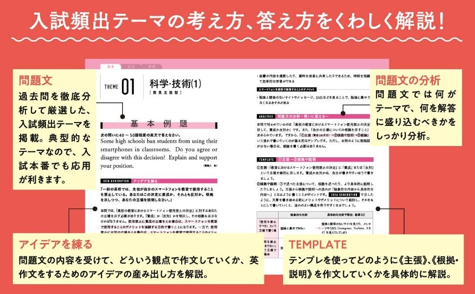 テンプレを学んだあとは、入試頻出のテーマ別(科学・技術、自然・環境、社会・文化、教育・学校など計10テーマ)に「基本例題」「応用例題」でトレーニングし、テンプレを自分のものにしていきます。