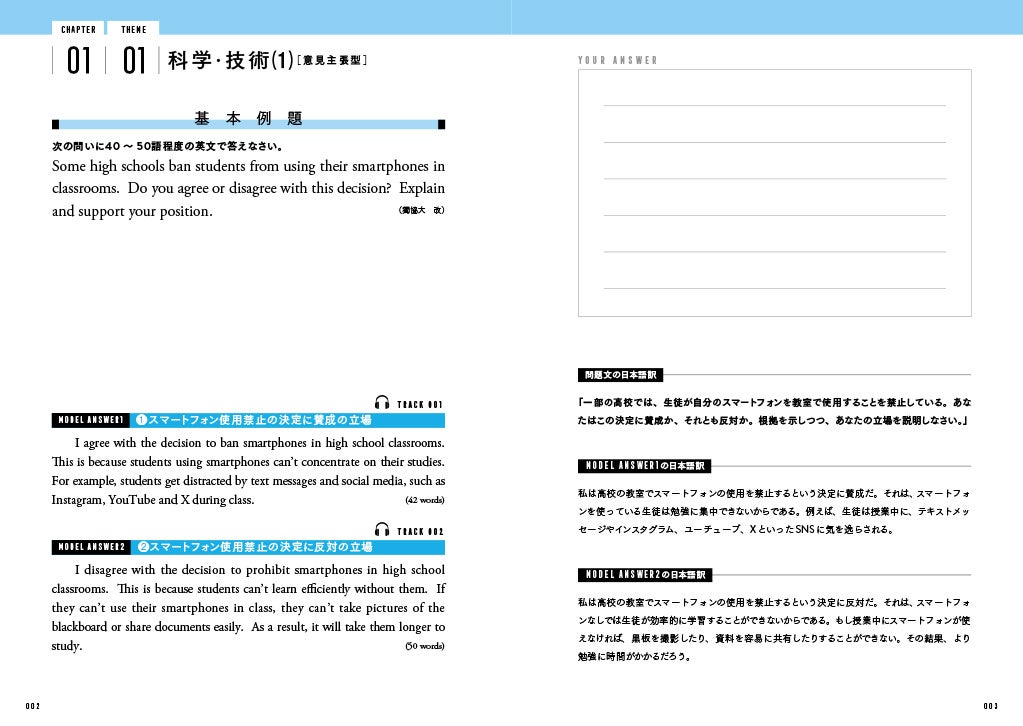 問題演習を通して、テーマごとの背景知識、主張を立てる際のアイデアの生み出し方、アイデアを論理的な構成に沿って書き進める方法をコンパクトに解説します。