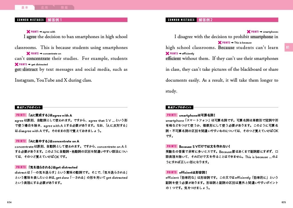 大学入試の英作文では、ライバルが「誰もがしてしまうようなミス」をなくす、つまり“減点されない”答案が書ければ、あなたの得点は相対的に向上します。本書の「COMMON MISTAKES」のコーナーでは、長年の入試分析に基づき、受験生が特に陥りやすい文法・表現のミスを厳選して徹底解説。これを事前に確認することで、大きな減点を未然に防ぎ、答案の完成度を劇的に引き上げます。