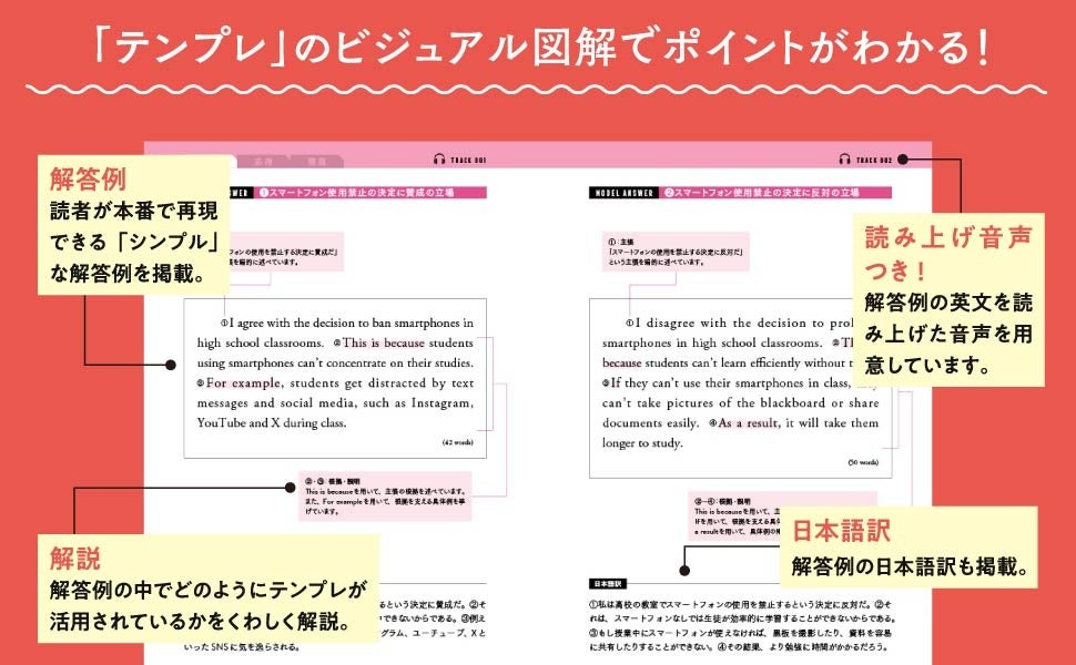 付属の別冊「テンプレ例文集」には、本冊の例題問題文と解答例を再掲しています。受験生が本番で書きやすい「再現可能性」を何よりも重視し、解答例はシンプルな英文で作成されています。別冊は本体から取り外して持ち運びができ、付属の読み上げ音声と併用することで、移動時間などを活用した「暗唱」「音読」といった効果的なトレーニングが可能です。音声は、スマートフォンの音声再生アプリに対応しているほか、MP3ファイルの無料ダウンロードもご活用いただけます。