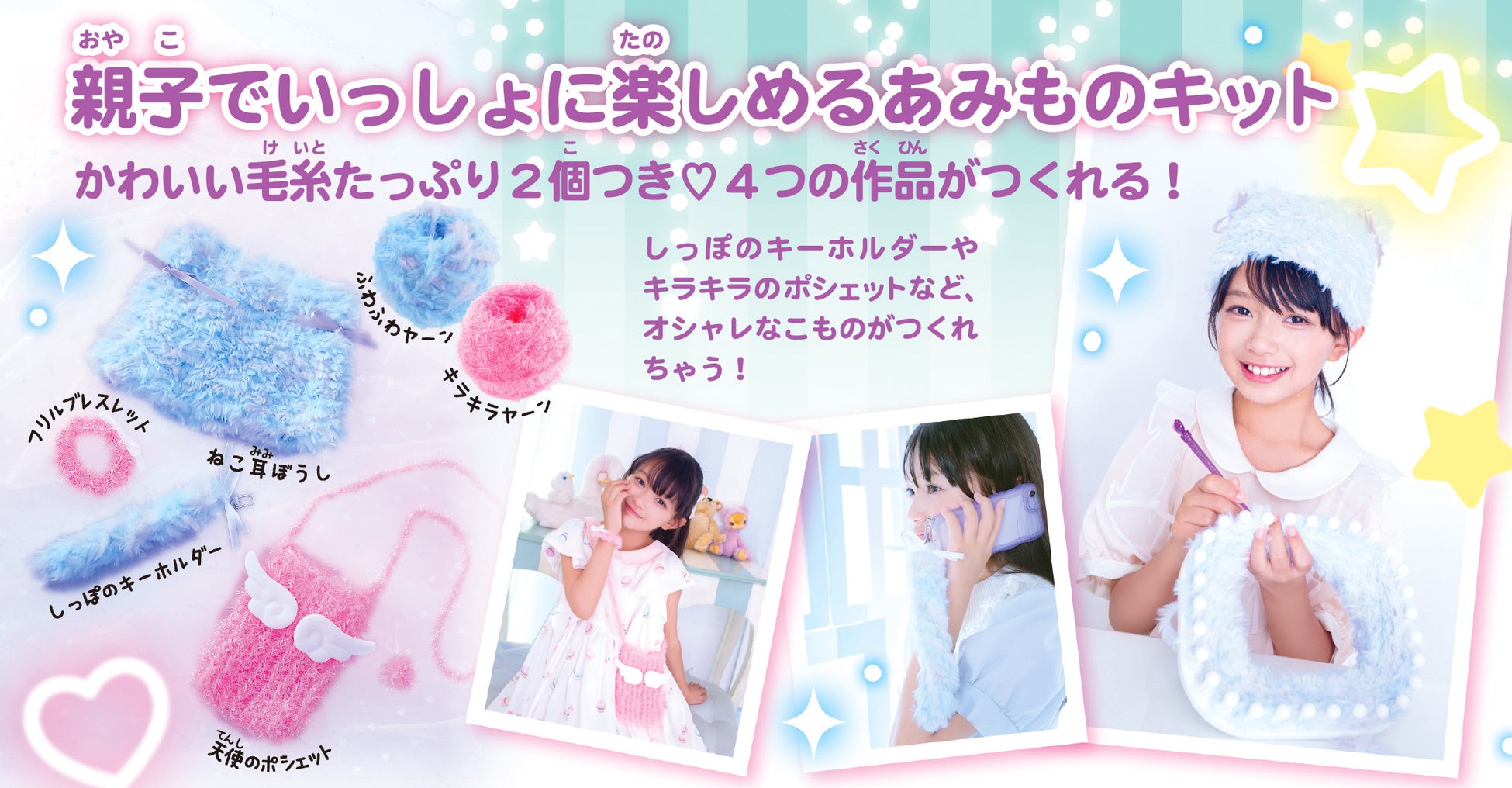付属の毛糸には、使いやすさへの工夫がいっぱい。水色マーブルの“ふわふわヤーン”は、編んでいる途中につなげずに済むように、2個分の毛糸を大きく1個の玉にまとめました。ピンクのキラキラヤーンは、キラキラ光る細い糸なので楽に2本どりできるように、2本いっしょにまとめて巻いて使いやすくしています。それぞれふわふわの「ねこ耳帽子」や「しっぽのキーホルダー」、キラキラの「天使のポシェット」、「フリルブレスレット」と4つのゆめかわアイテムがつくれます。どんな毛糸でもすくいやすいように設計された、特製の使いやすいフックもついています。