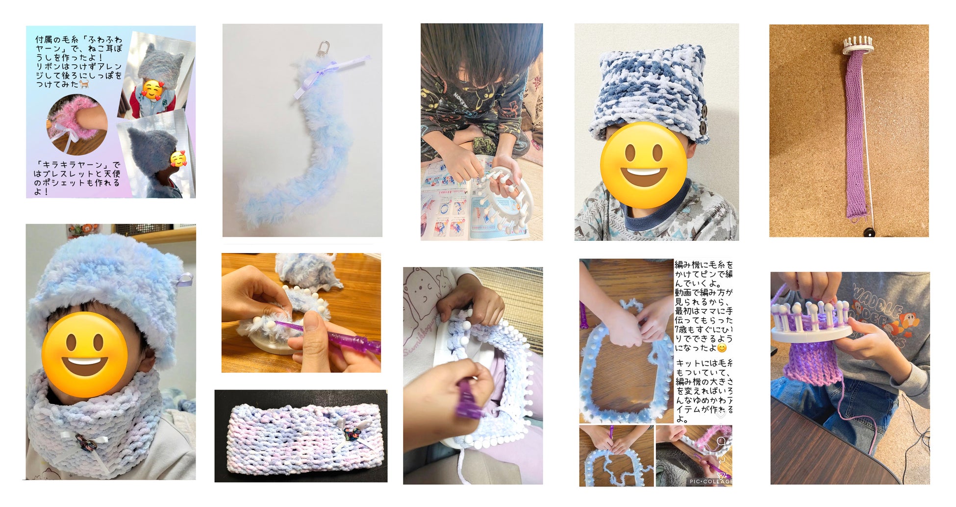◎自分で毛糸を用意すれば、編み機のニッティングルームを使って、どんどん作品をつくり続けることができます。編み物はまだ難しいと思っていた我が家の7歳と10歳の子どもも、可愛い作品がつくれました! 自分でつくったふわふわアイテムは愛しさもひとしお。
