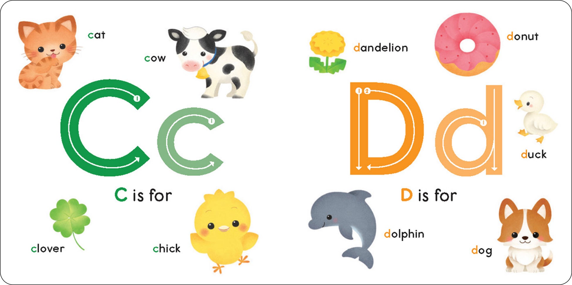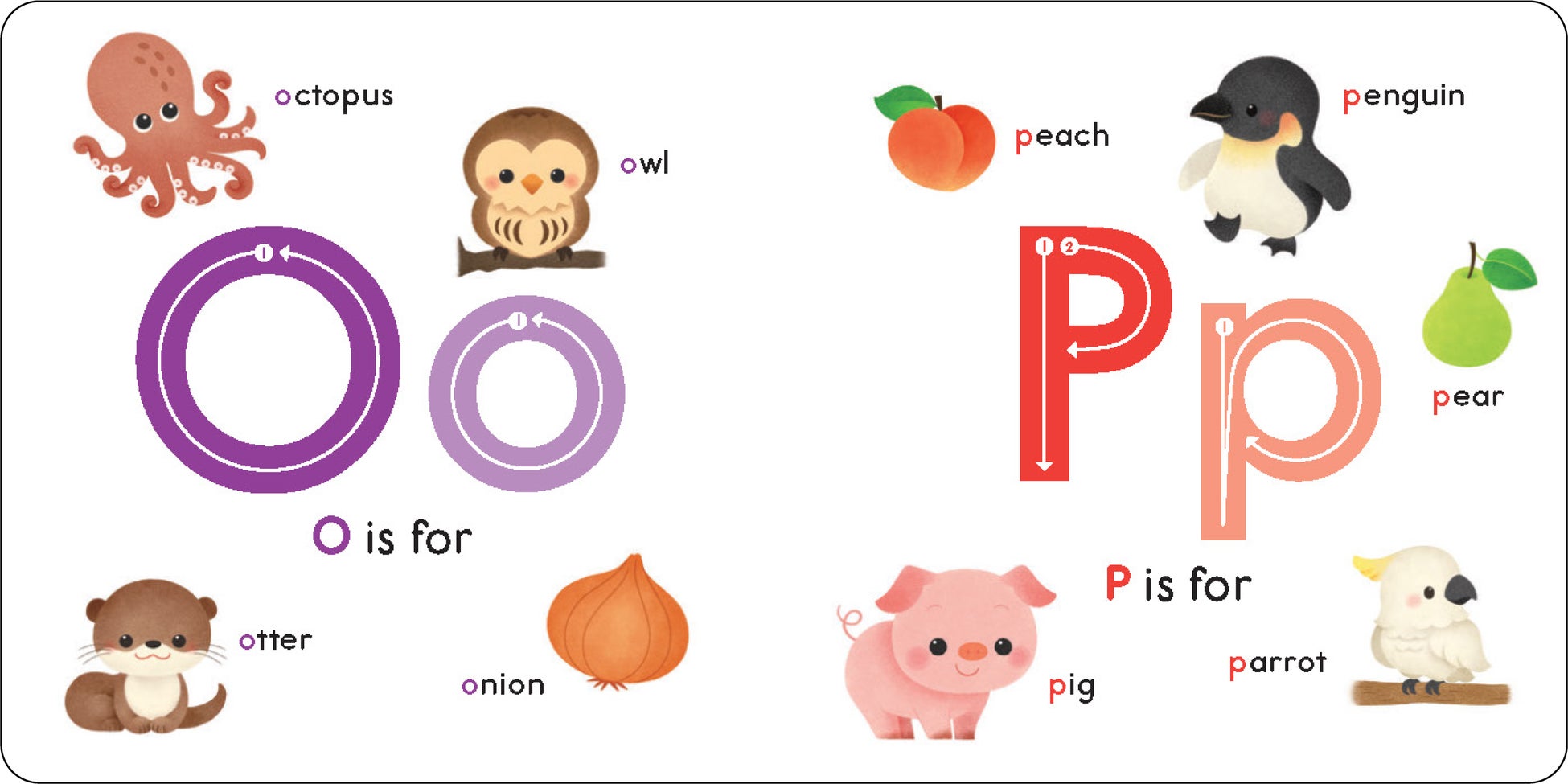 本書では、アルファベットを子どもたちが身近に感じる動物や身の回りの物の名前と組み合わせて紹介。