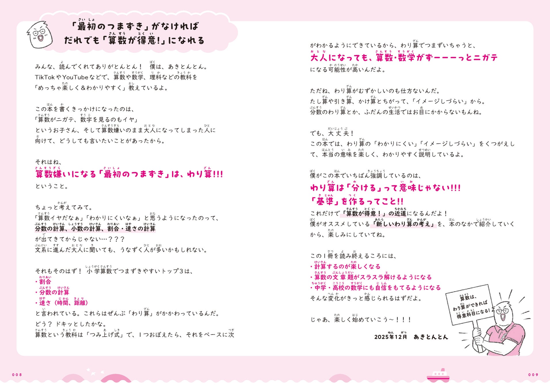 本書は「算数・数学・理科をめっちゃ楽しく&わかりやすく」教えるスタイルで、多くの視聴者の支持を集め、TikTok Awards Japan 2024を受賞したプロ算数YouTuber、あきとんとん氏が長年の教育経験から導き出した、算数嫌いを克服して得意科目に変えてしまう夢のような一冊です。