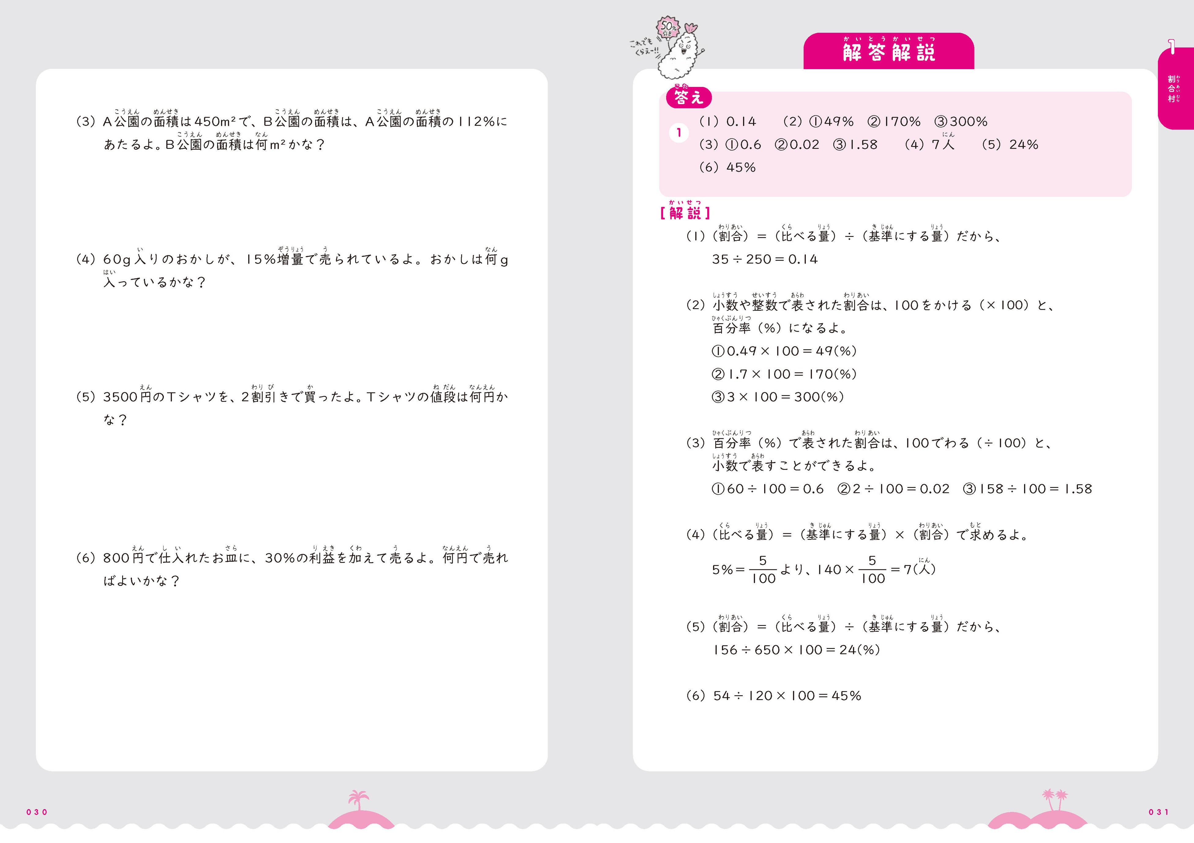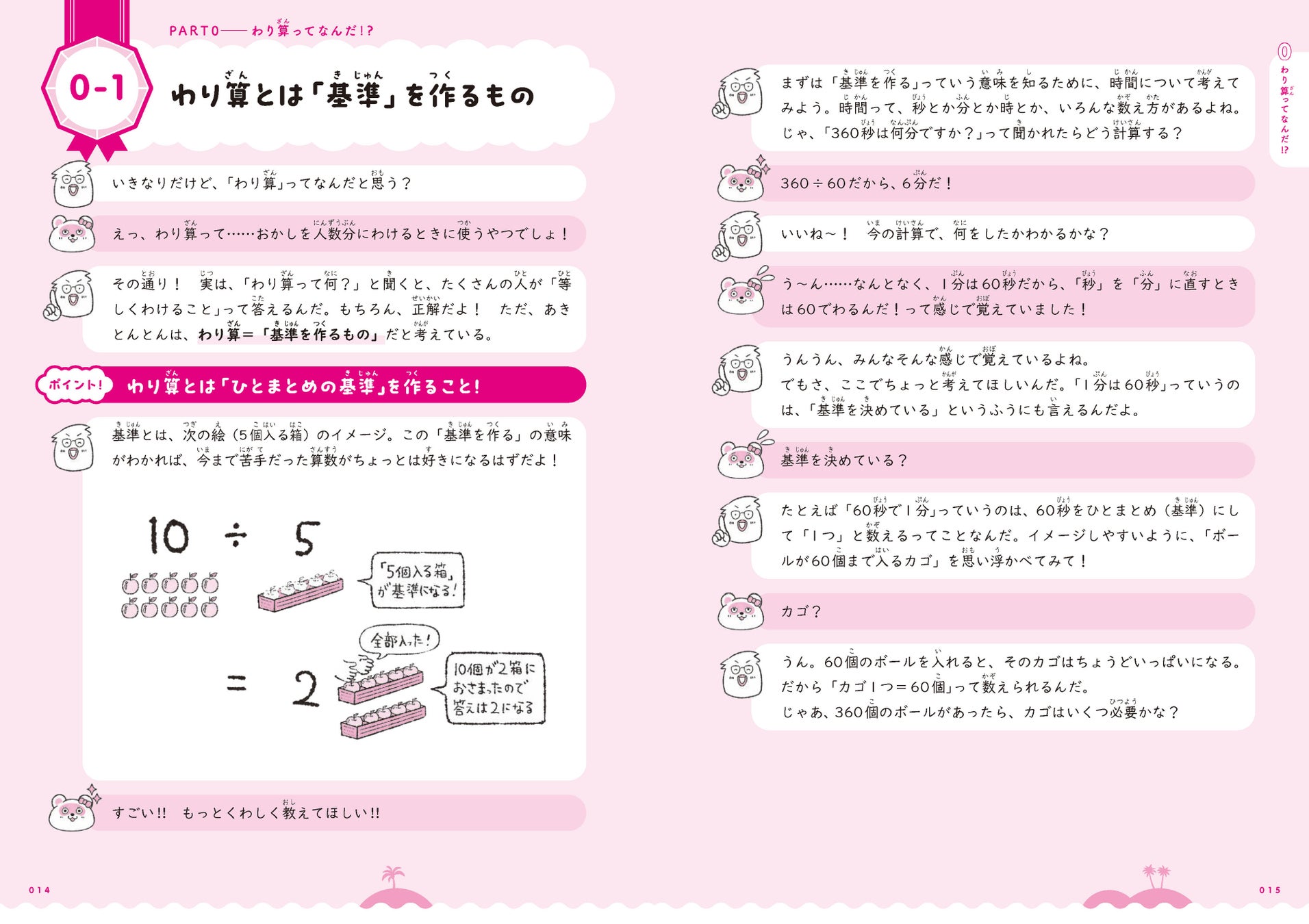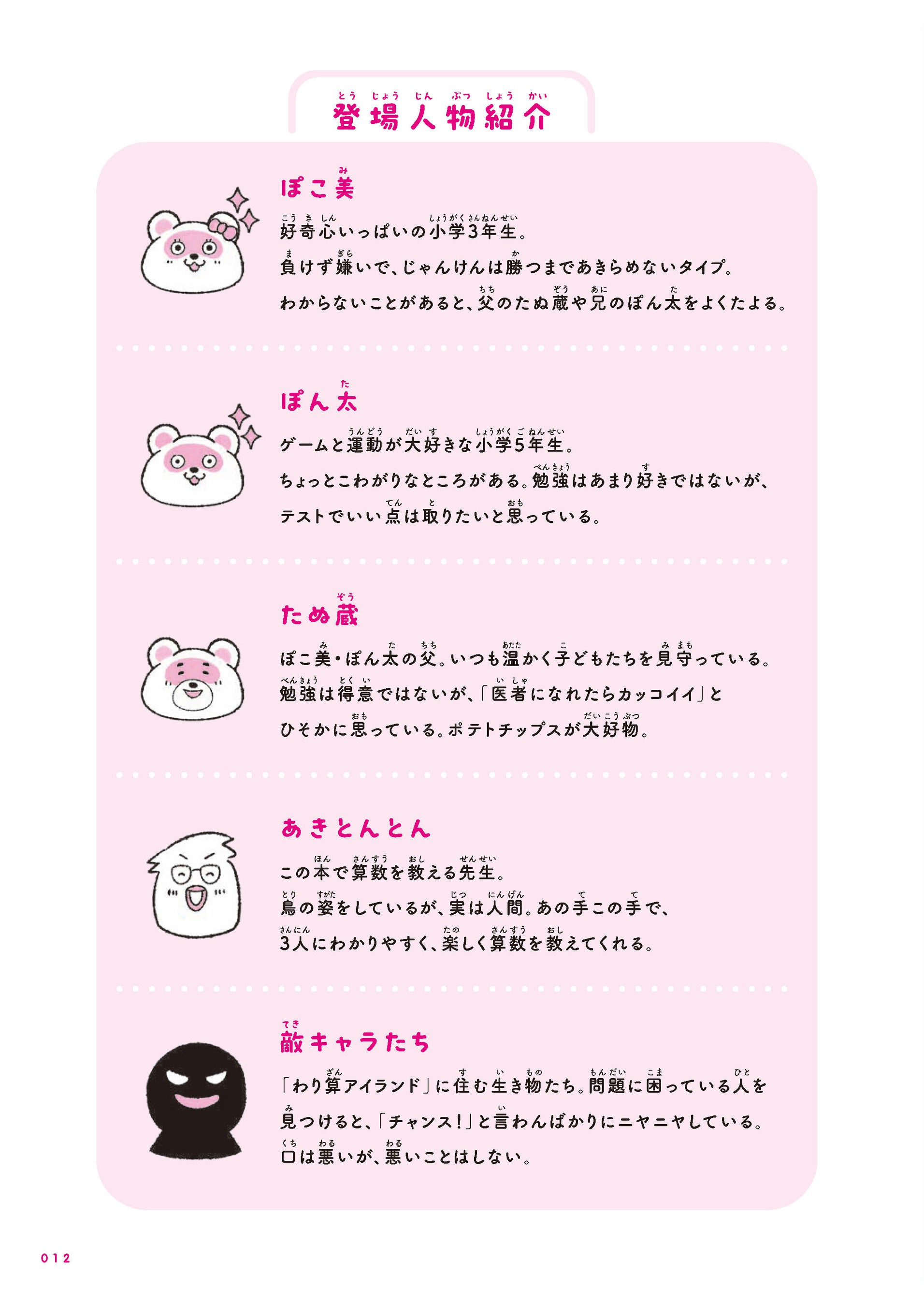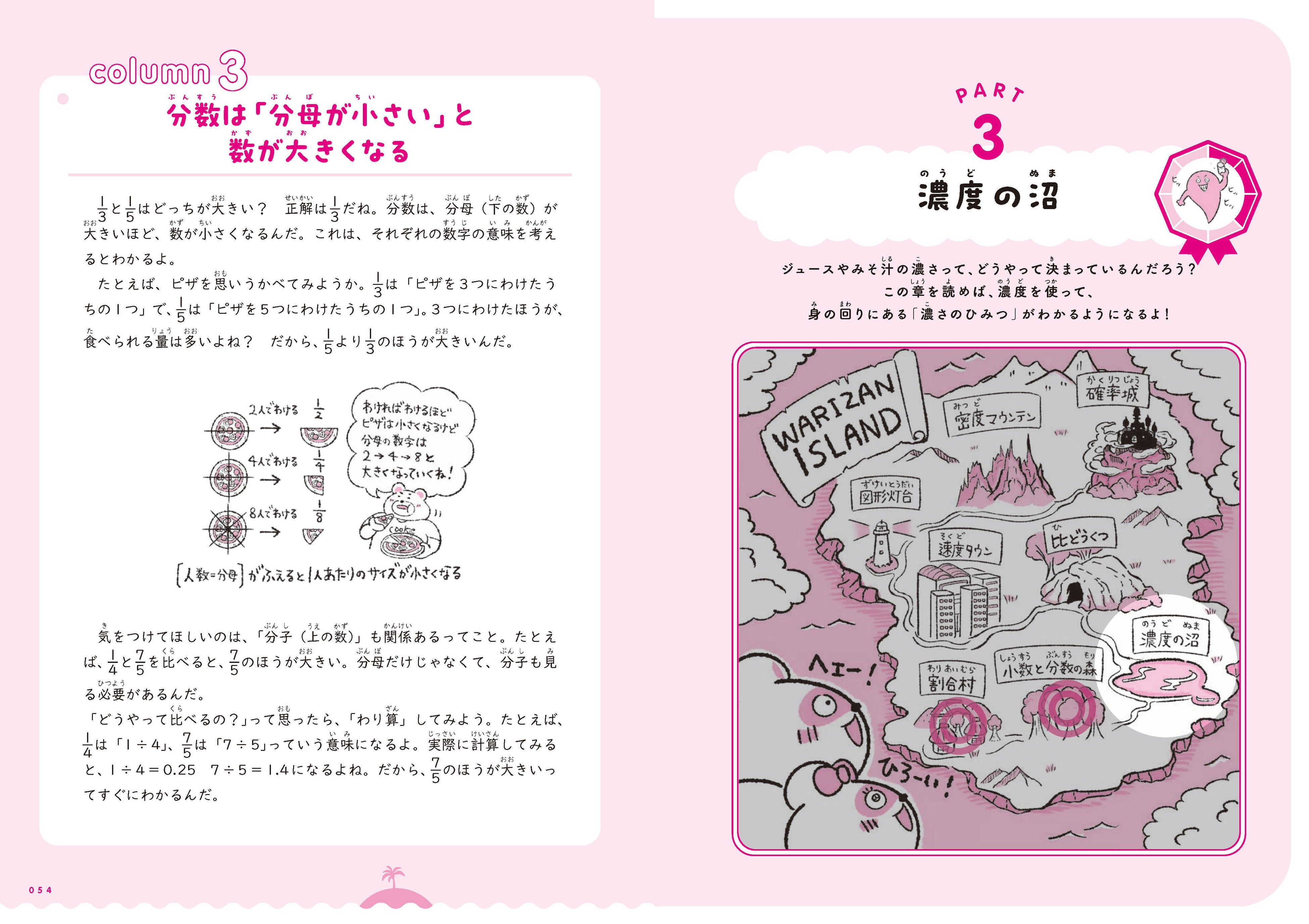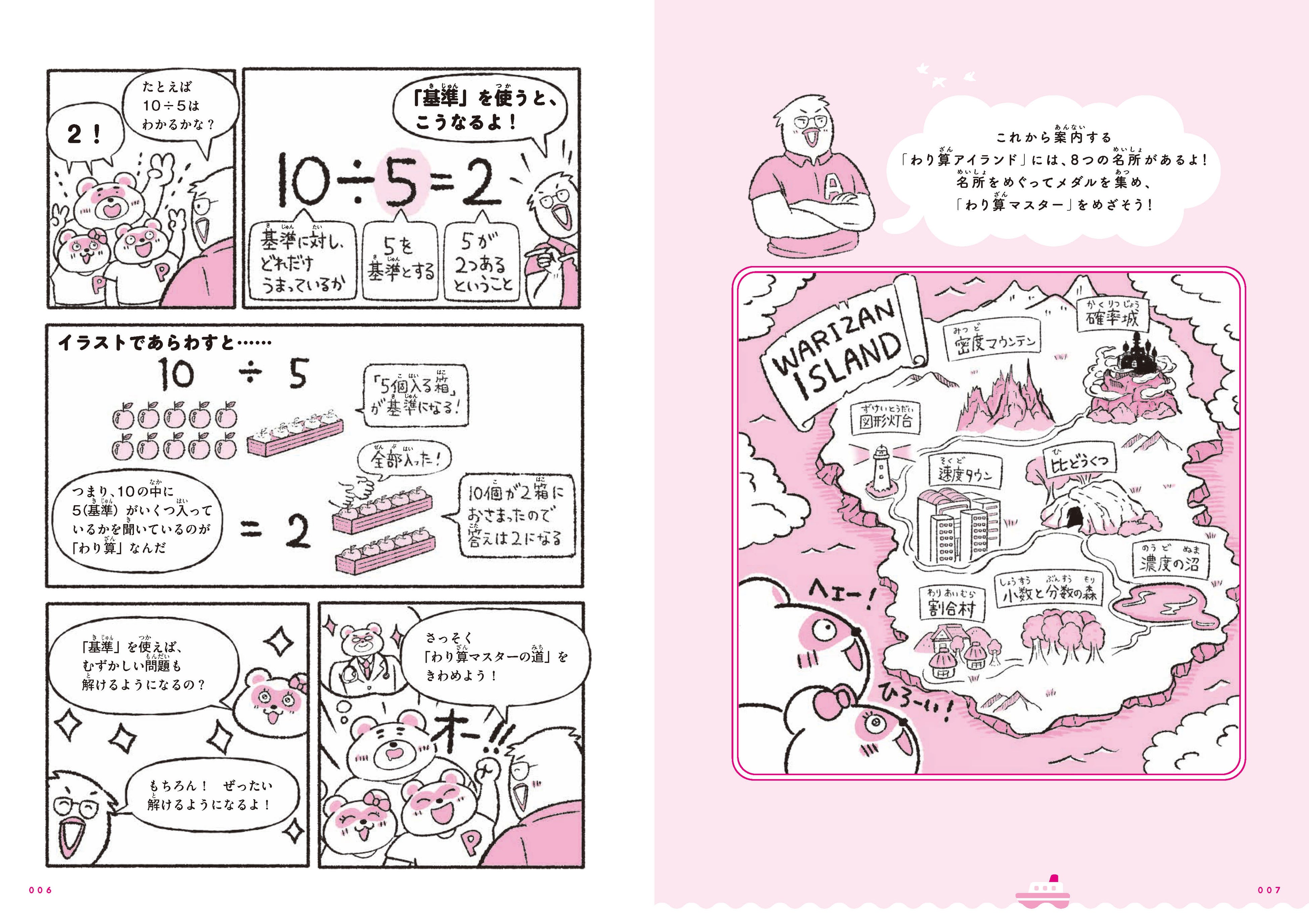 本書の中では、あきとんとん氏が鳥の姿をした先生となって登場。ぽこ美、ぽん太兄妹とともに、読者を「わり算アイランド」への冒険に誘います。「割合村」「小数と分数の森」「密度マウンテン」など、テーマごとに分かれた8つの名所を巡ってメダルを集めることで、算数の重要概念が自然と身につく構成となっています。キャラクターたちの対話形式で展開していくので、ゲームを攻略するような感覚で、楽しく、飽きることなく読み進めることができるのも本書ならではの特長です。