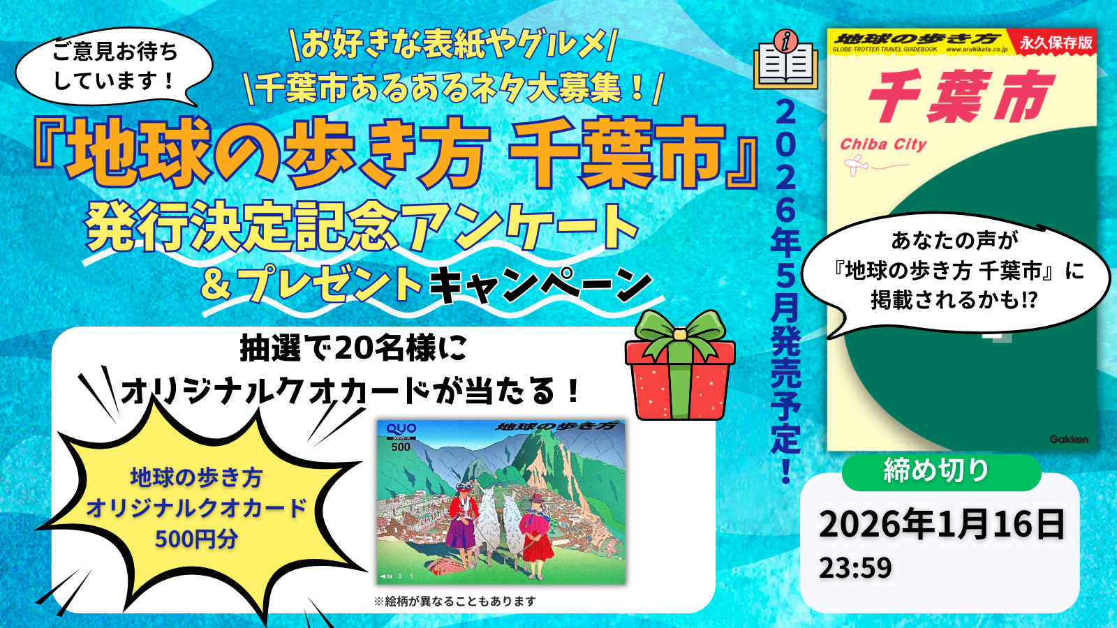 『地球の歩き方 千葉市』の制作決定を記念し、2025年12月16日より発行決定記念アンケート&プレゼントキャンぺーンがスタート。『地球の歩き方 千葉市』の表紙を飾るイラスト案や、地元で愛されるグルメやおすすめスポット、思わずうなずく“あるあるネタ”など、千葉市を知る皆さまからクチコミを大募集。