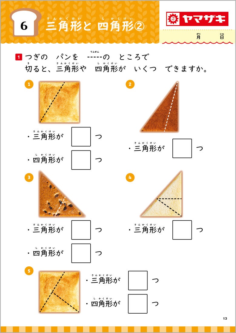 このドリルは、実生活に即した問題が多いことも特長です。たとえば、四角い食パンを2つにカットするとき、1つの角(かど)と反対側にある角を結ぶ対角線で切れば、食パンは2つの三角形になります。角から少しずらして、辺と辺を結ぶ斜めの線で切ると、今度は2つの台形になります。また、ふだん捨てるときに何気なくつぶしているお菓子の箱は、広げると展開図になります。