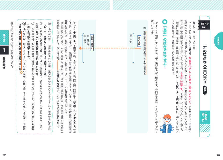 本書は、まずは、弱点をしっかりあぶり出すところからスタートし、効率よくトレーニングできる構成になっています。Section1「論理的な文章」と Section2「文学的な文章」の冒頭には、それぞれ読解力をチェックする問題を用意。最初に自分の弱点を把握することで、的確に学習を進められます。