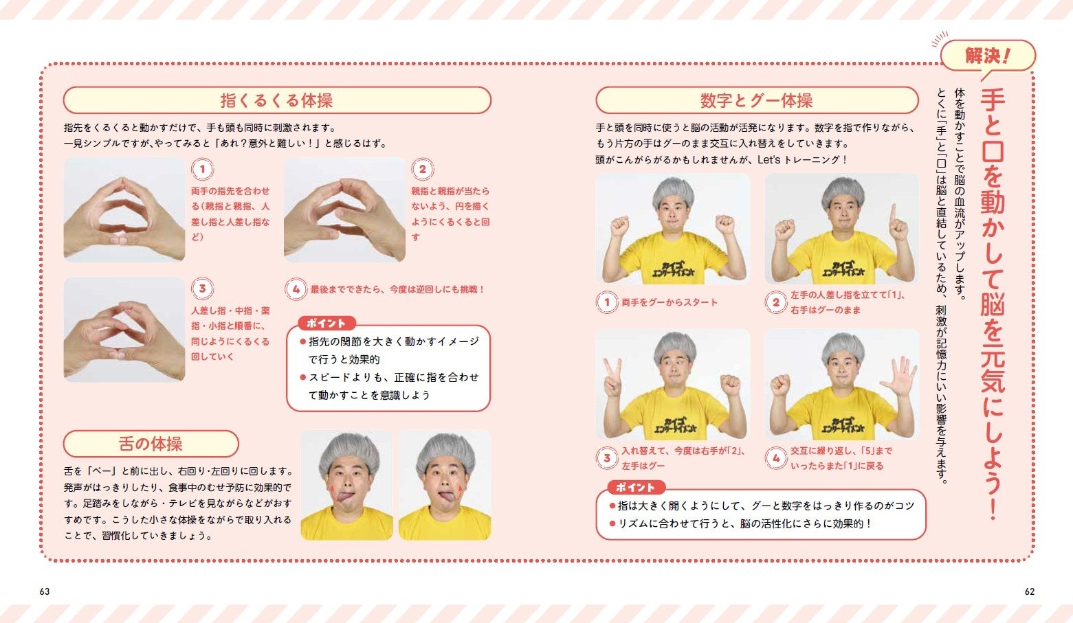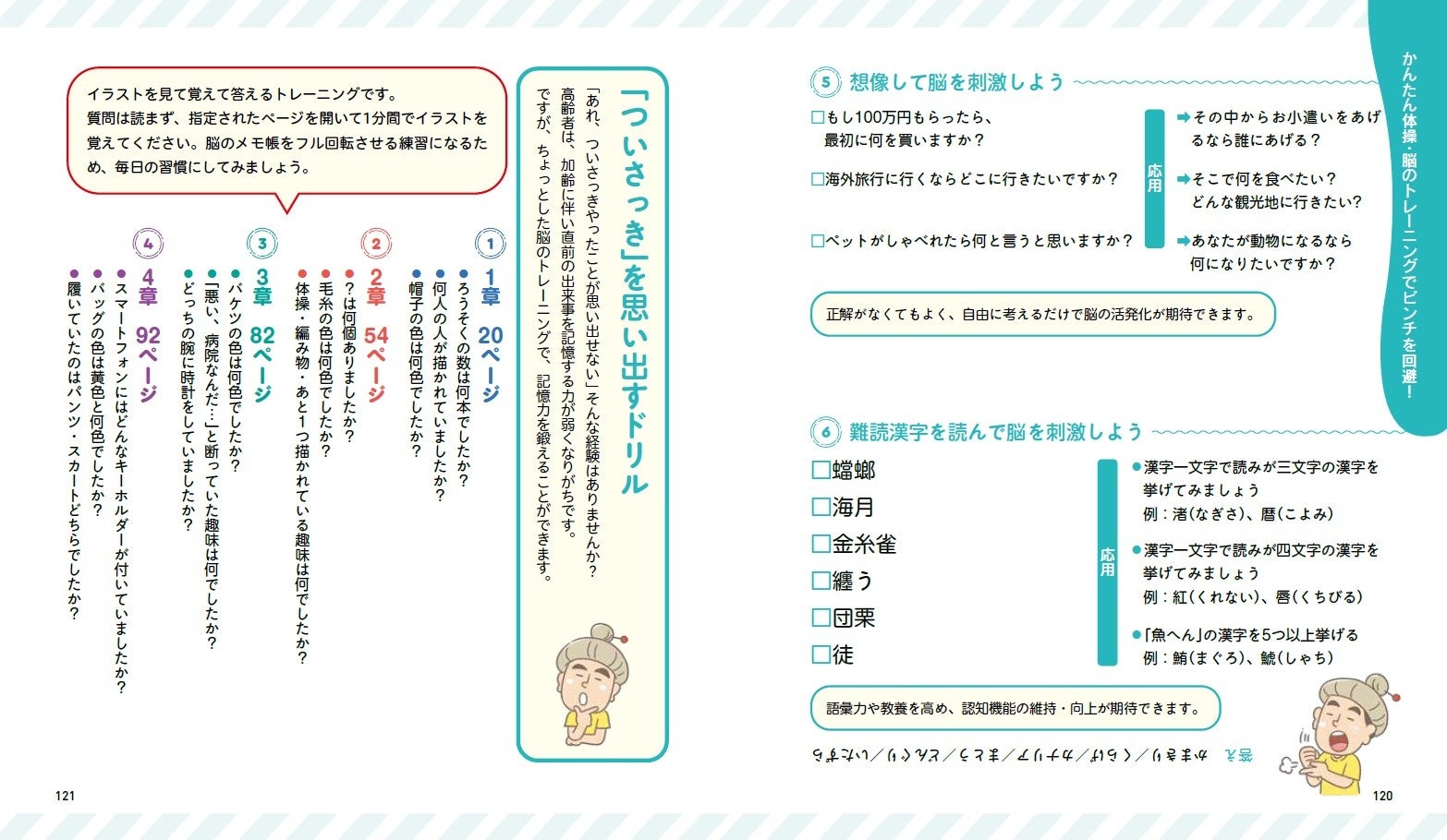 介護エンターテイナー・作業療法士の立場から、今日からできるかんたんな体操やストレッチ、思わずやりたくなる脳トレクイズなどを紹介。高齢者が遭遇しがちなピンチを楽しく乗り越え、明るく健康な毎日を過ごしていくためのポイントが満載です。