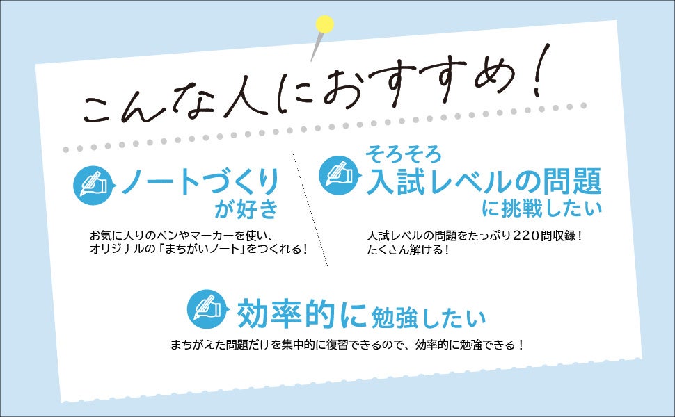 「まちがいノート」は、自分専用の「弱点集」なので、見返すだけで効率的に点数アップがねらえます。冬休みに入り、受験勉強もラストスパートです! 本書で、「まちがいノート」をつくり、弱点をしっかり克服して、志望校合格を目指しましょう!