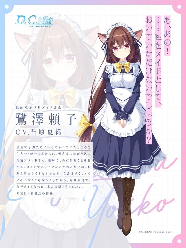 株式会社ブシロード(本社:東京都中野区、代表取締役社長:木谷高明、以下ブシロード)は、株式会社CIRCUSから2002年に発売されたゲーム『D.C. ~ダ・カーポ~』のフルリメイク作品として発売される『D.C. Re:tune ~ダ・カーポ~ リチューン』に登場するヒロインのキャラクター情報とキャストを初公開したことをお知らせいたします。