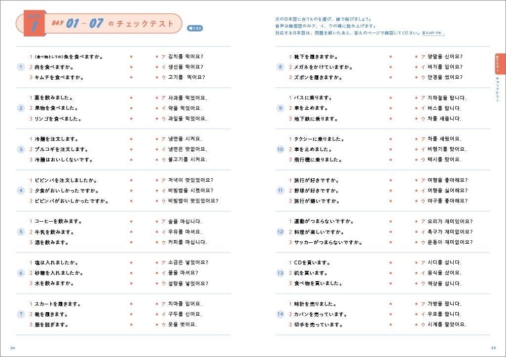「ハングルは正直まだあやふや」「ハングルは一度覚えたけれど、読むのにまだ時間がかかる」――そんな人でも安心して取り組めるよう、本書にはハングルの基礎を確認するページを用意しています。さらに、学習中に迷わないようハングルには読みのふりがなを併記。「ハングルが読めなくて学習が止まってしまう」ストレスを減らし、無理なく学習を続けられます。