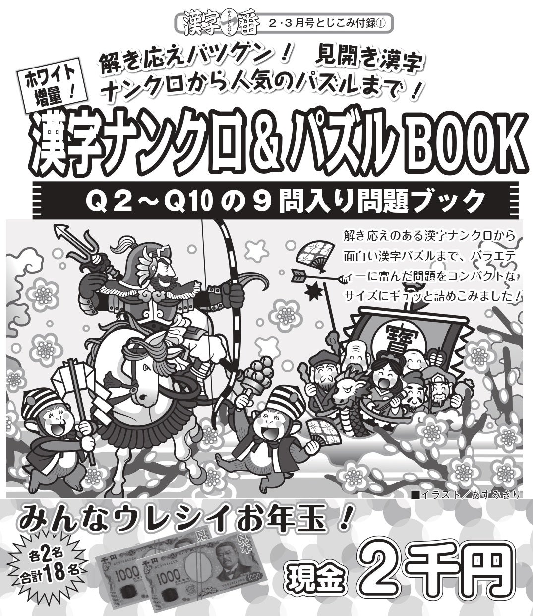 『漢字一番2・3月号』の特別付録は、さらにもう一冊あります。解き応え抜群の漢字ナンクロと人気のパズルを一冊にまとめた問題ブックです。特に今回は人気のホワイトナンクロを増量、お年玉として全問に現金プレゼントつき。この問題ブックを含め、2・3月号では選りすぐりの傑作ばかりを全46問掲載しています。