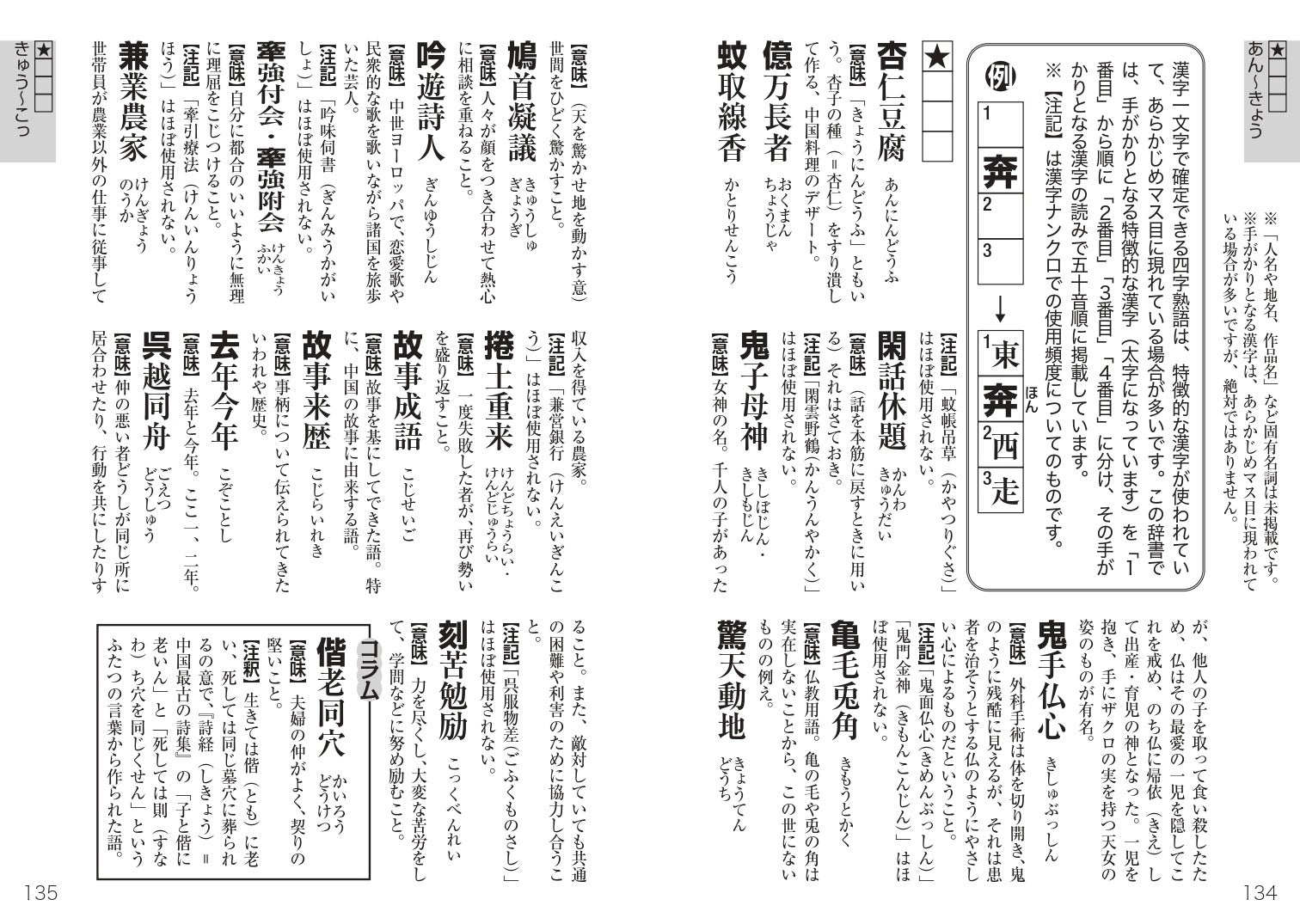 特別付録「たった一文字で確定できる! 即解! 四字熟語辞典」は、手がかりとなる漢字一文字の入る位置が分かれば、四字熟語が確定できるという、漢字ナンクロファン垂涎の夢のような一冊です。