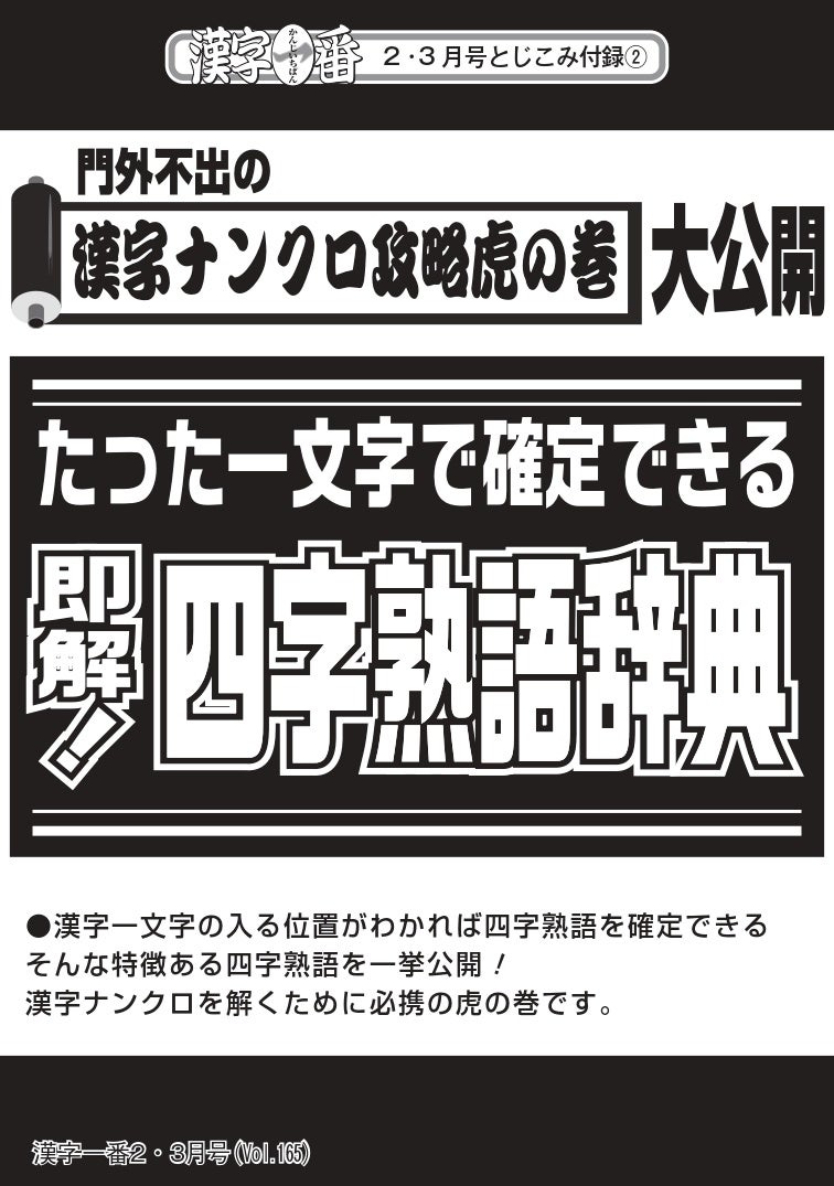 漢字と日本語をとことん遊ぶ、漢字ナンクロ&漢字パズルがいっぱいの『漢字一番』2・3月号には、2大特別付録がついています。その一つが、漢字ナンクロを解く際の、強力な虎の巻となる「即解! 四字熟語辞典」。