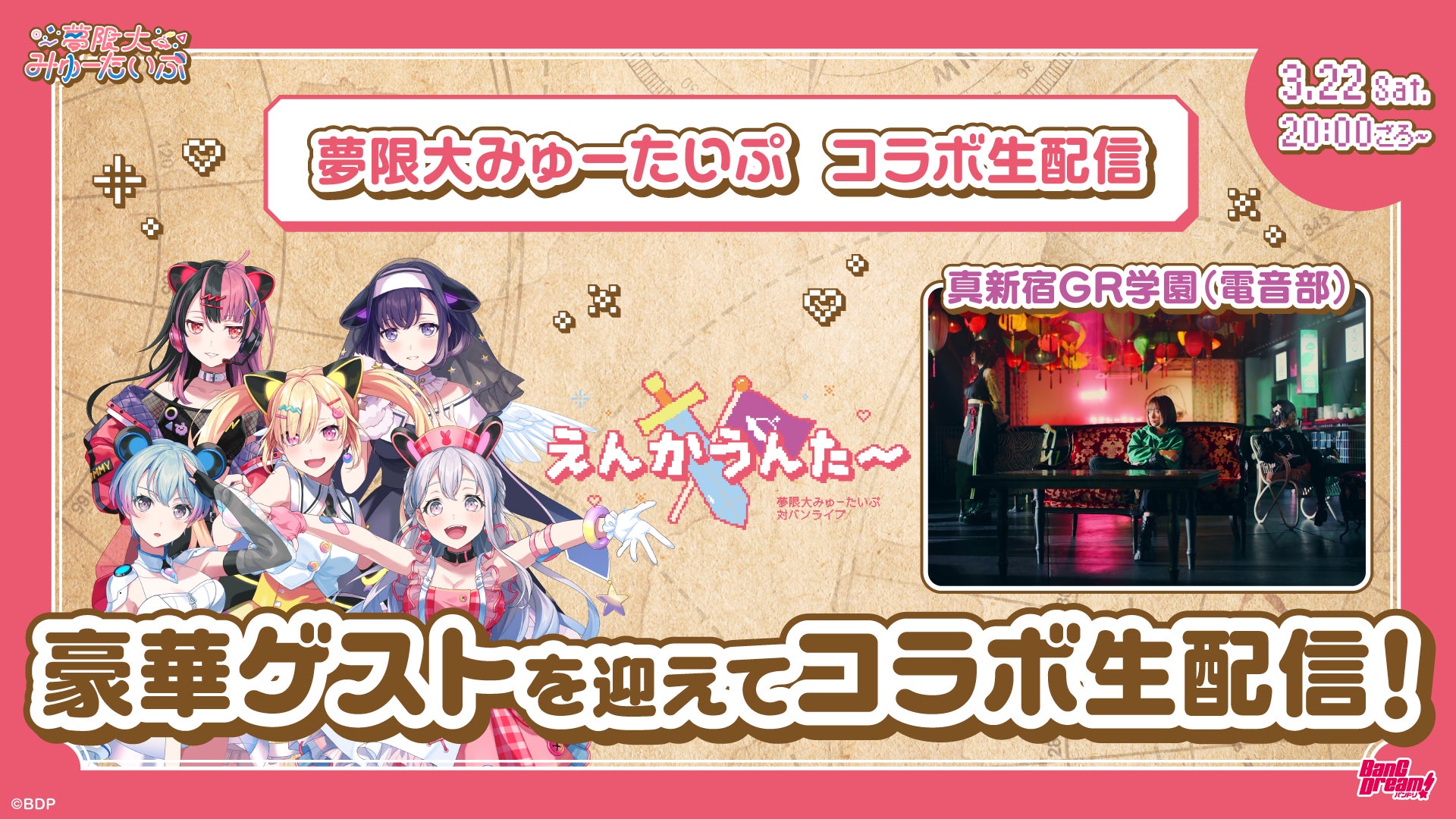バンドリ!プロジェクトより誕生したバーチャル系バンド「夢限大みゅーたいぷ」(通称:ゆめみた)は夢限大みゅーたいぷ公式YouTubeチャンネルにて、3月22日(土)に真新宿GR学園(電音部)とのコラボ生配信を実施しました。